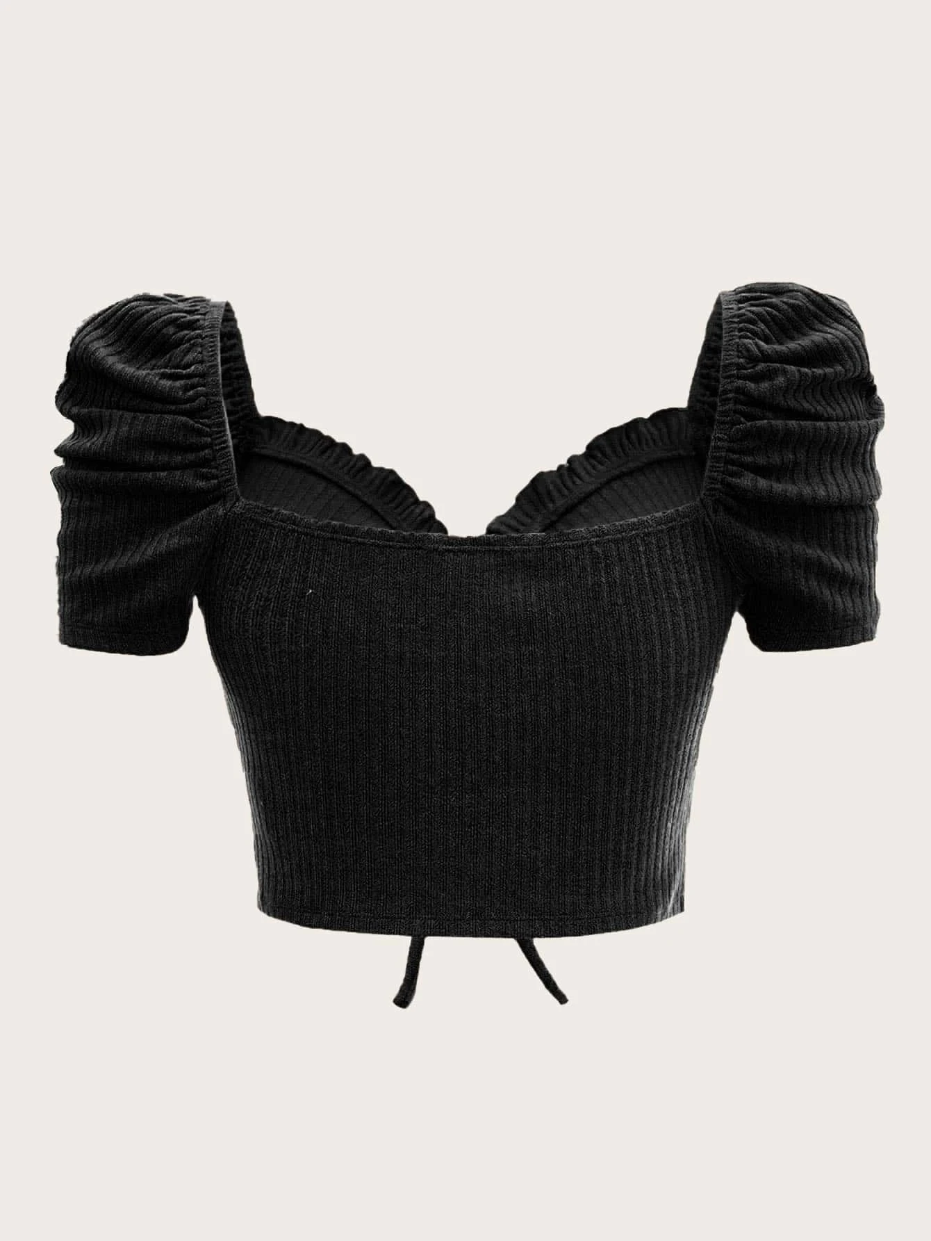 Camiseta de manga farol ribete fruncido con cord?n fruncido