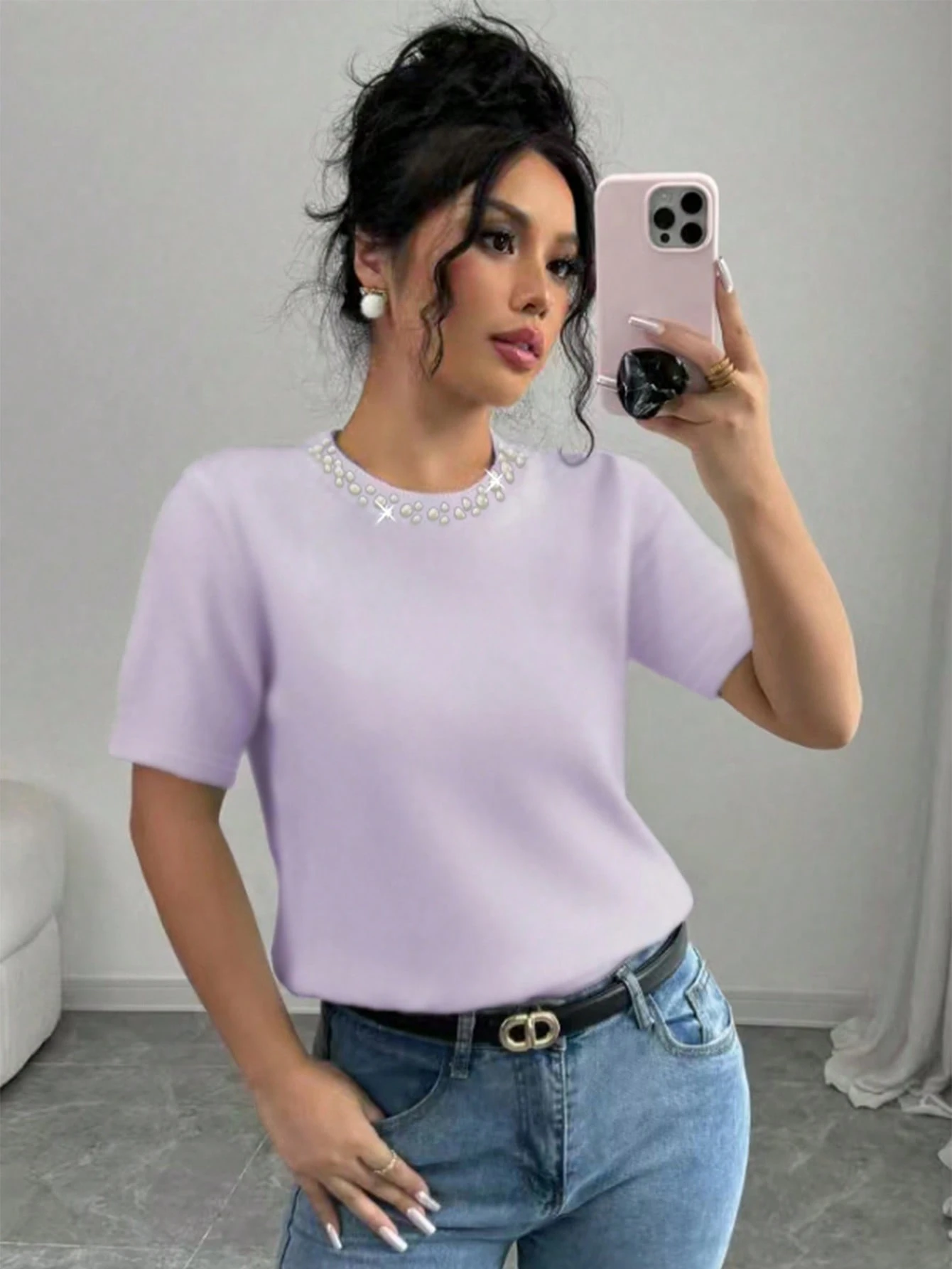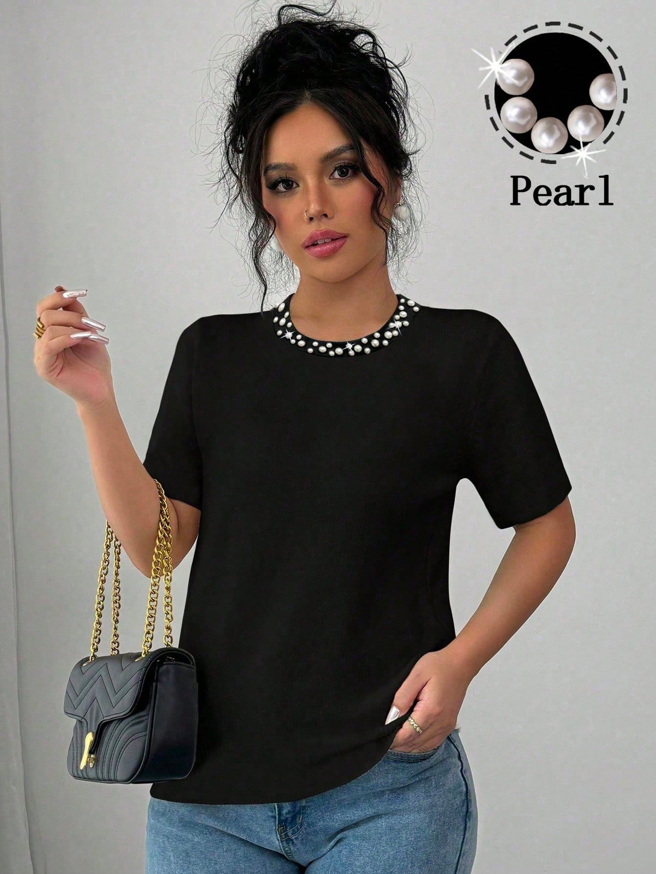Camiseta elegante de mujer de manga corta con decoración de perlas falsas