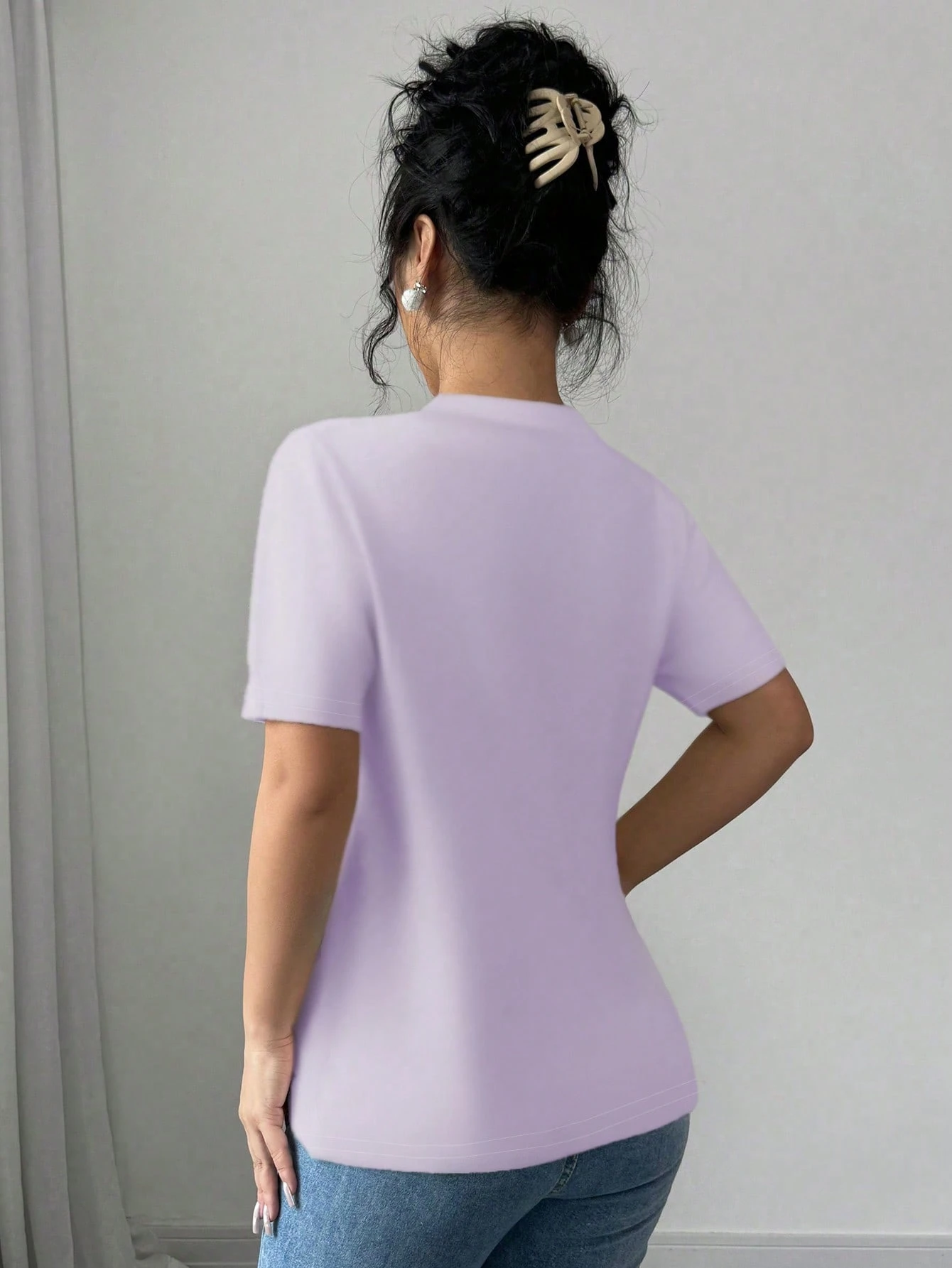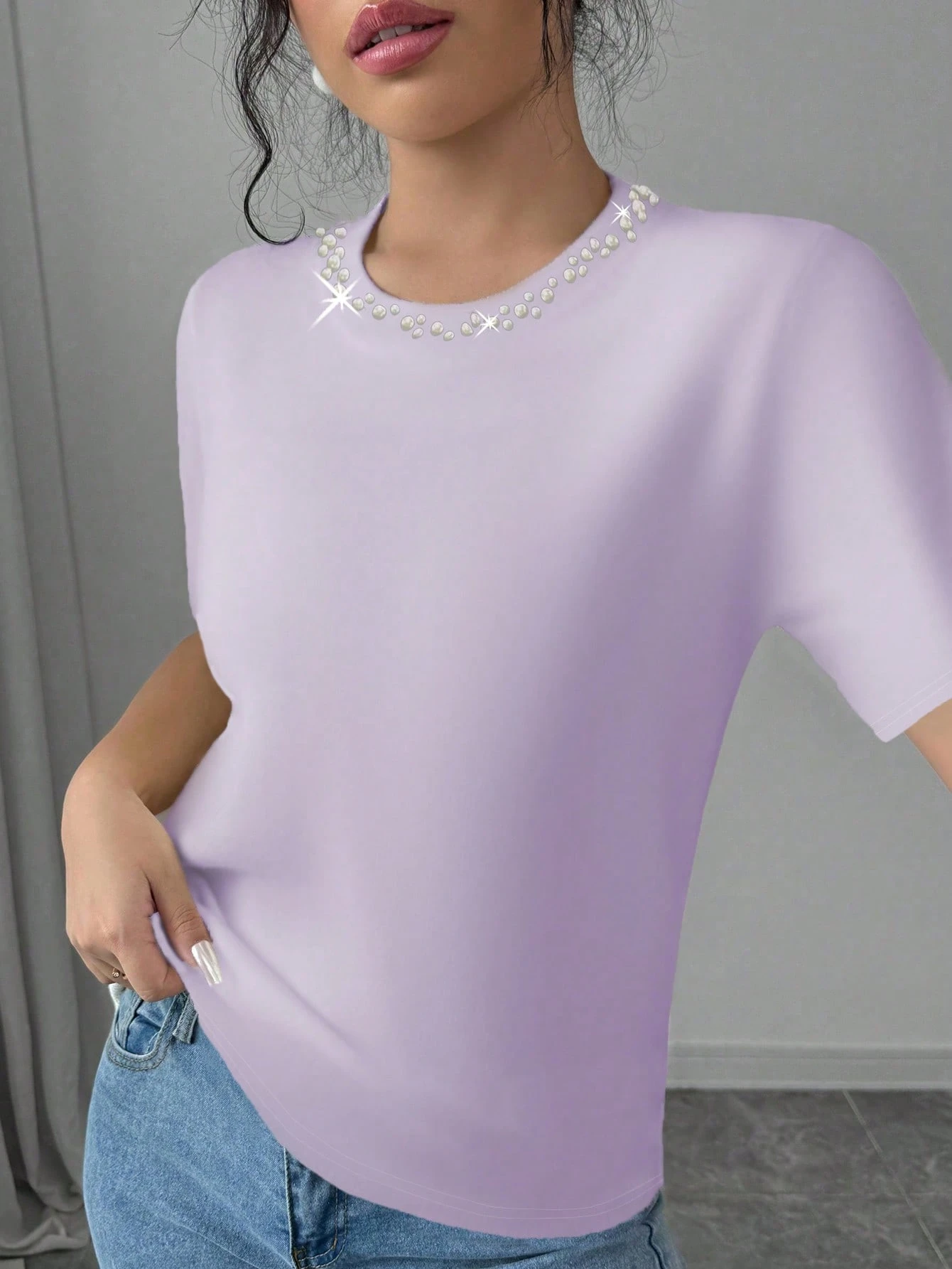 Camiseta elegante de mujer de manga corta con decoración de perlas falsas