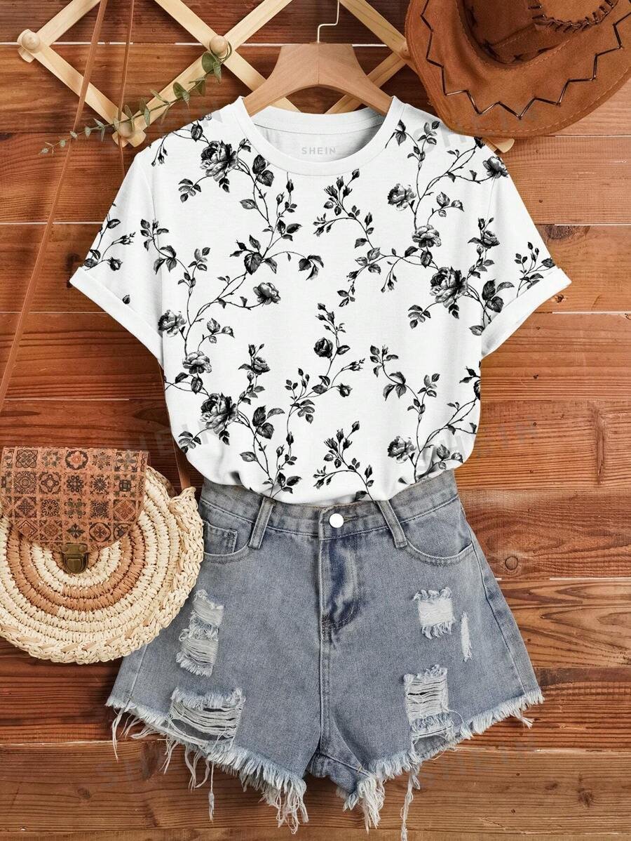camiseta gráfica de mujer con estampado floral y bloques de color