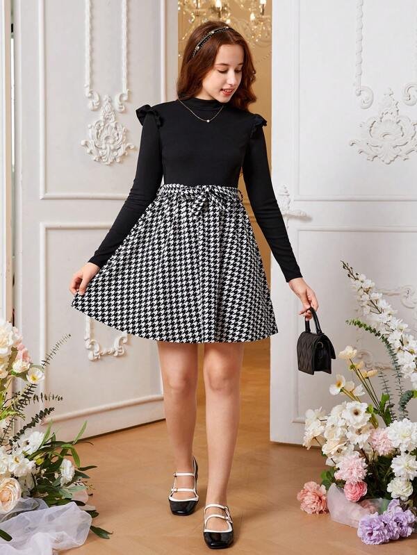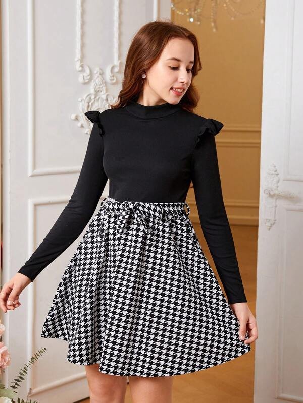 Chica adolescente Vestido con cintur?n con estampado de pata de gallo ribete con fruncido