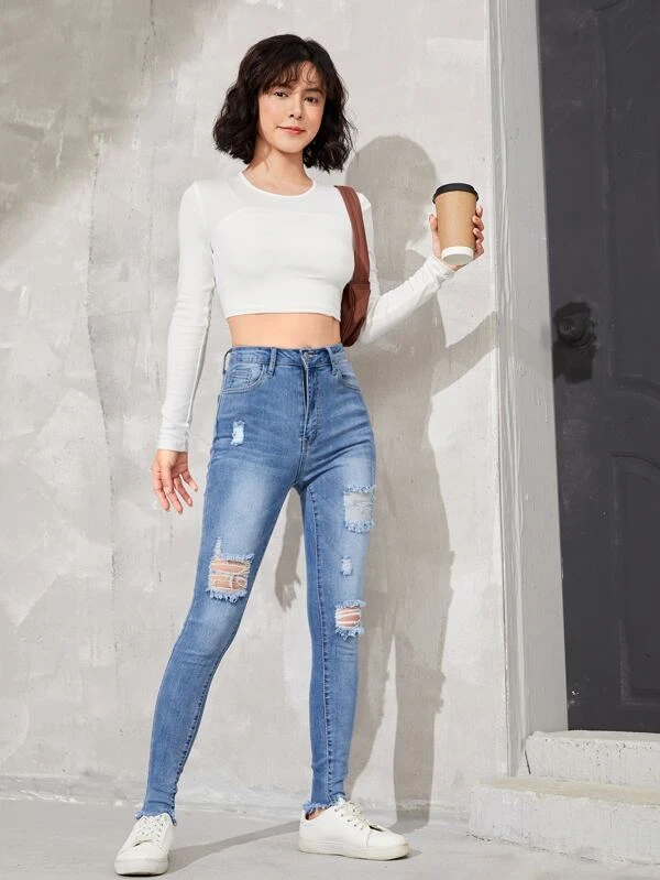 Chicas adolescentes Jeans desgarro con lavado ligero