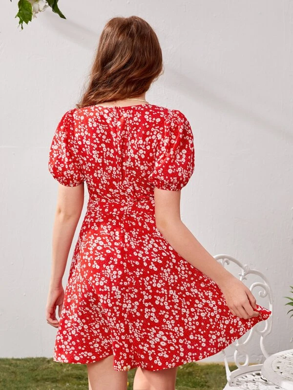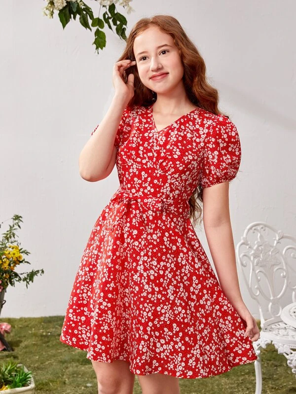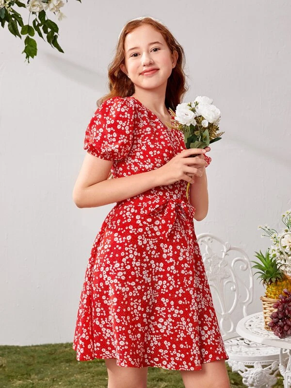 Chicas adolescentes Vestido con cintur?n con estampado floral de manga farol