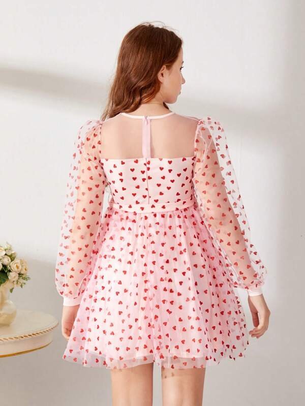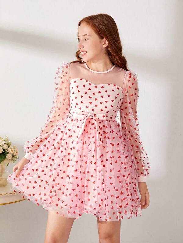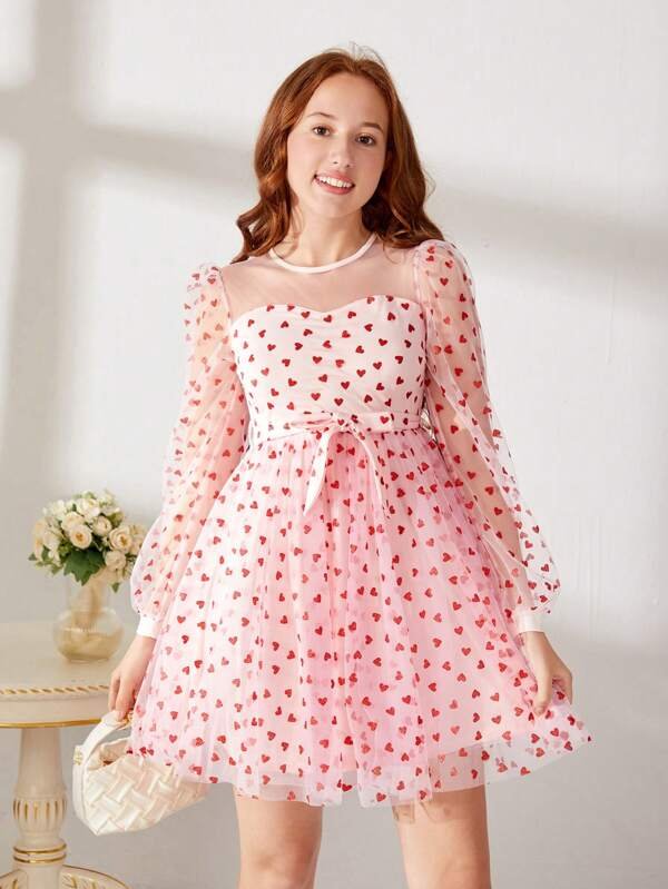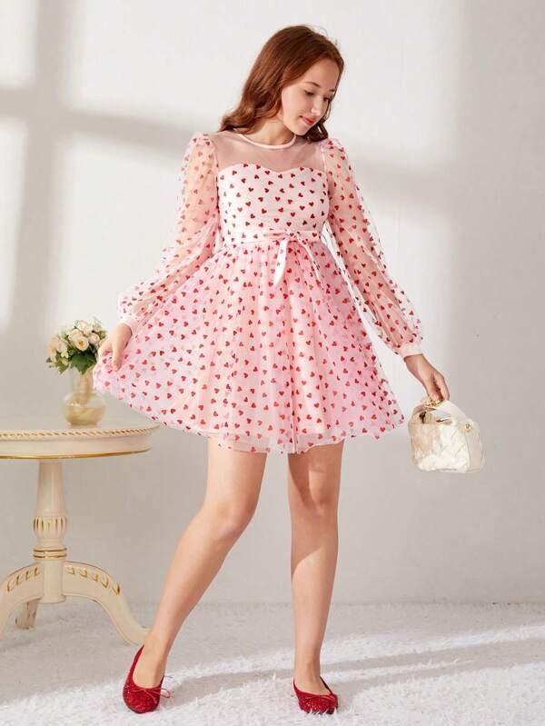Chicas adolescentes Vestido de manga farol con cintur?n brillante con patr?n de coraz?n de malla
