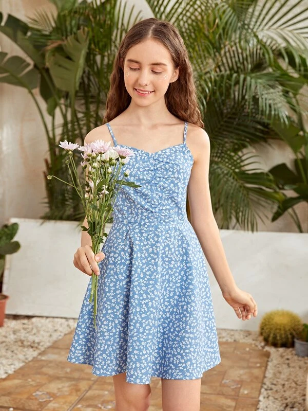 Chicas adolescentes vestido de tirantes floral con dise?o fruncido