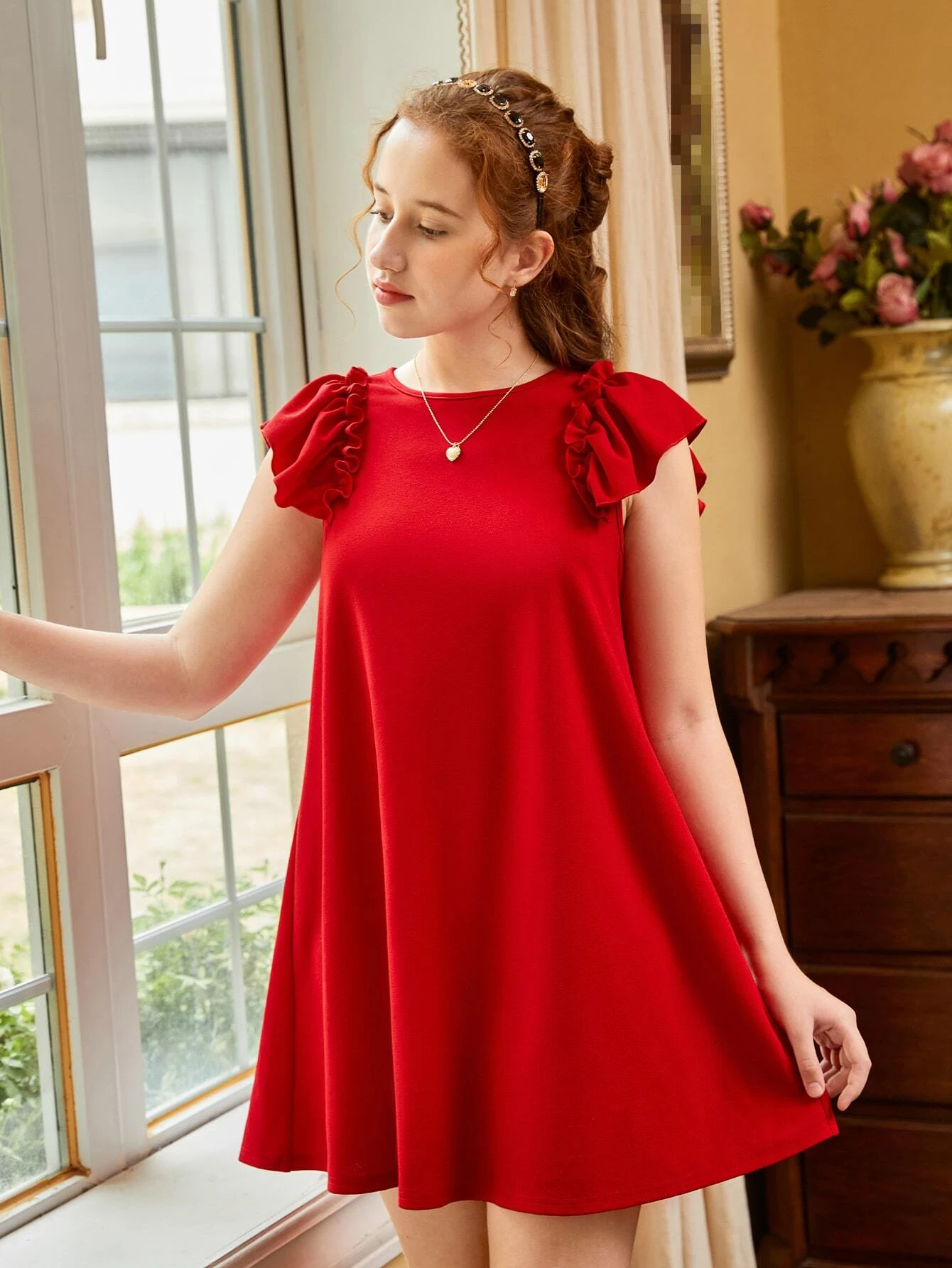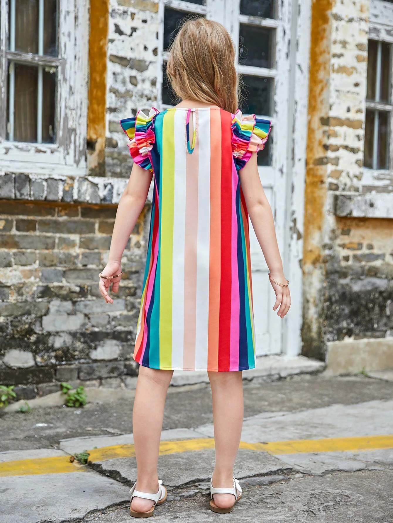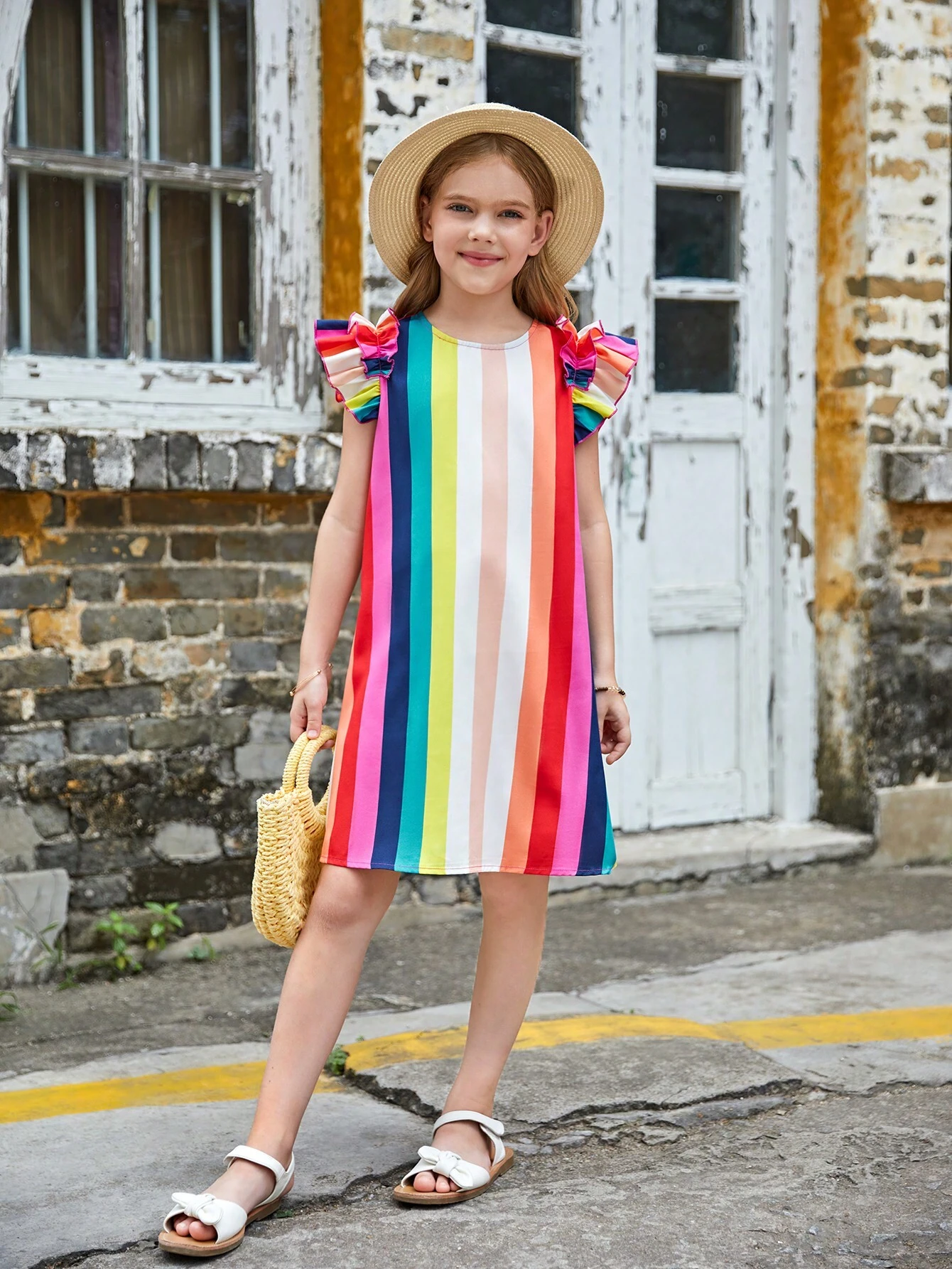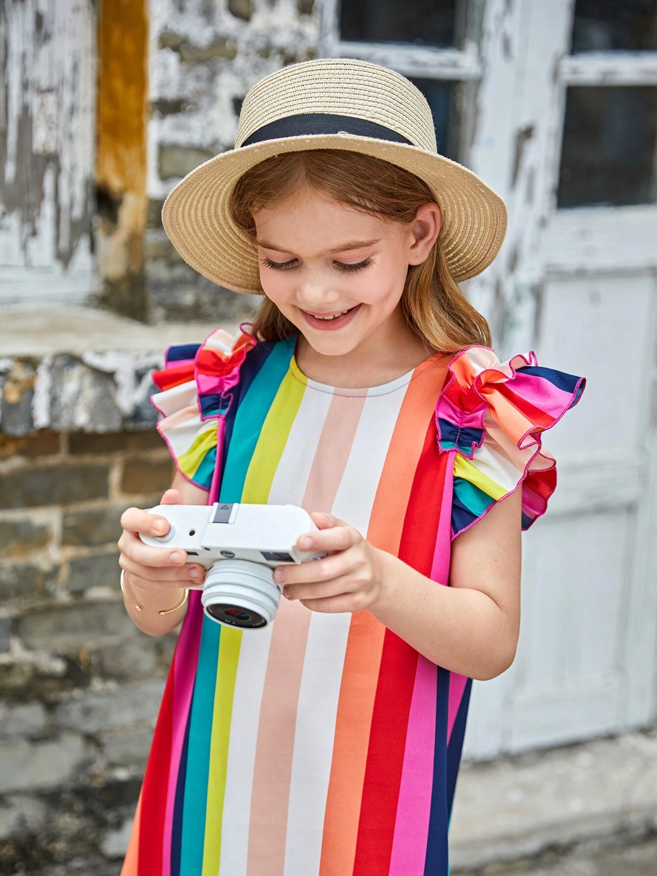 Chicas Vestido de rayas de arco?ris ribete con fruncido