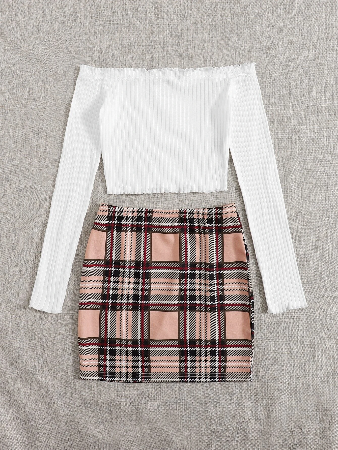 Conjunto camiseta de borde en forma de lechuga de hombros descubiertos con falda