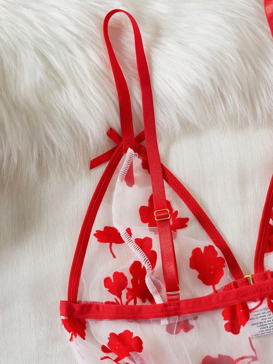 Conjunto de lencería de mujer con vestido de malla con adorno floral y tanga