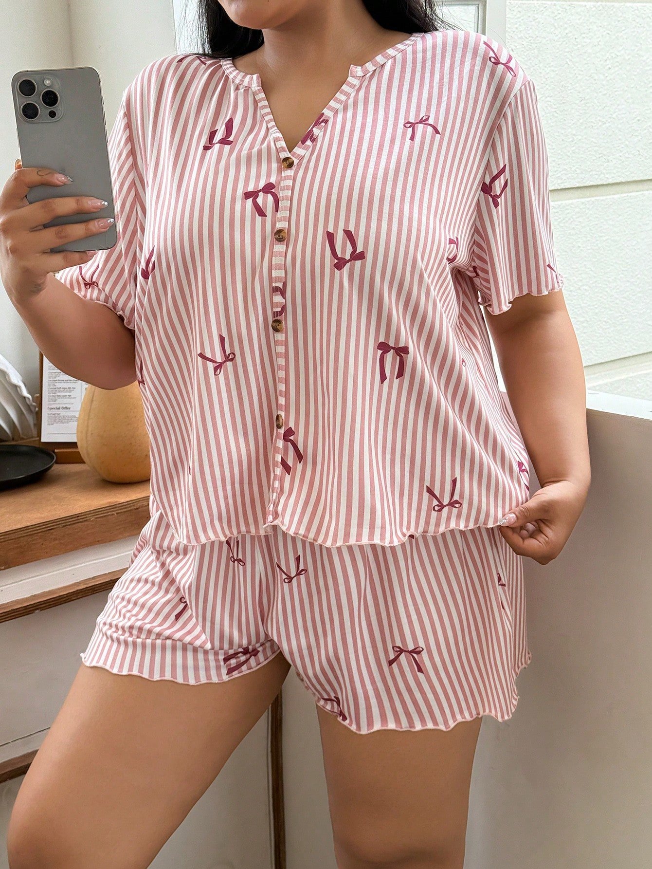 Conjunto de pijama casual con botones, estampado de rayas y moño