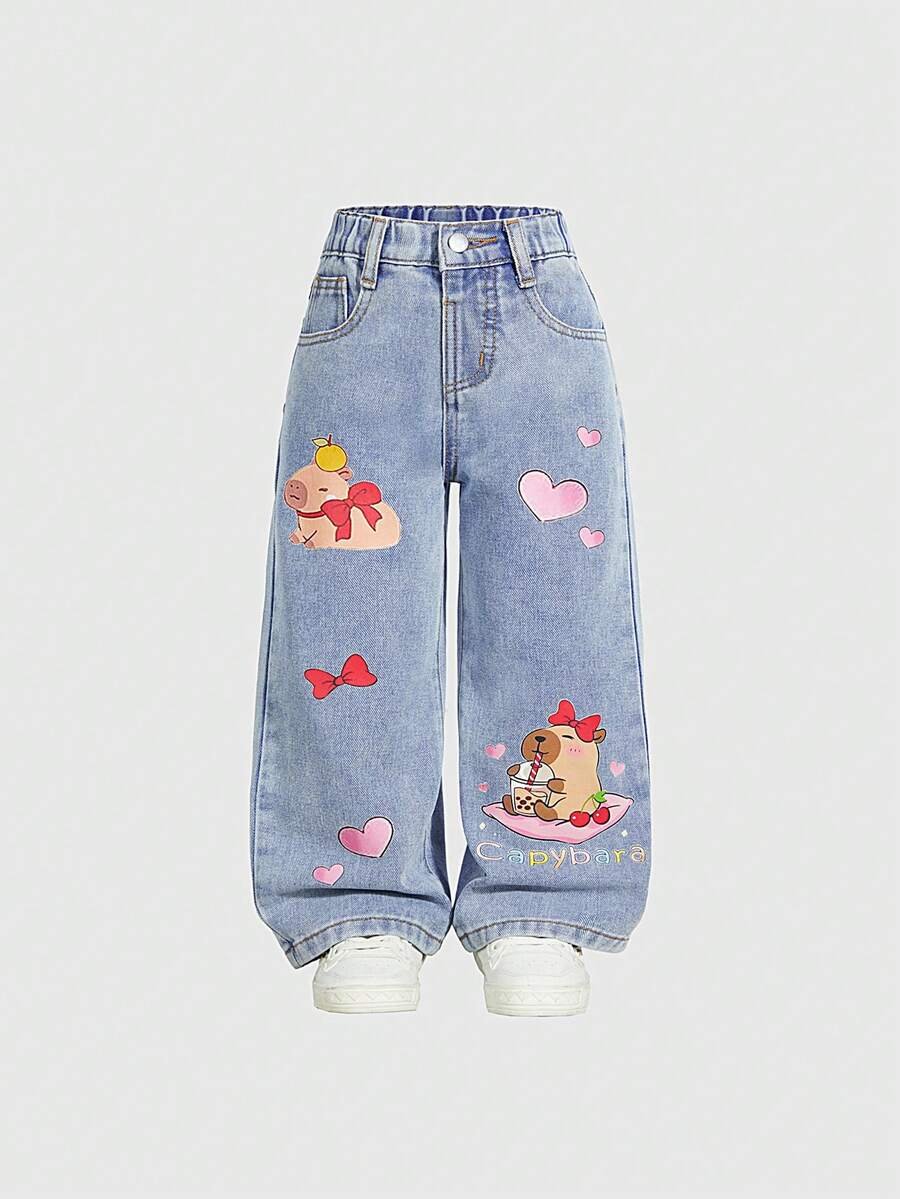 Jeans de pierna recta con cintura elástica, estampados de mariposas y corazones