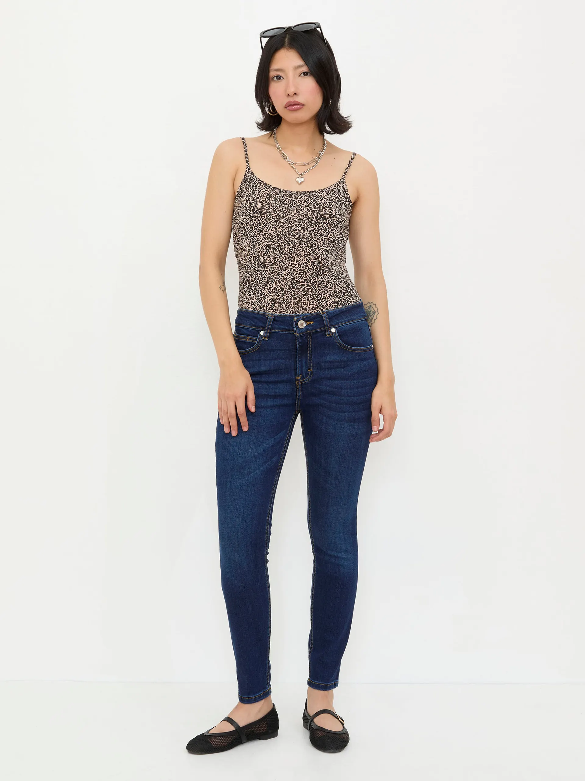 Jeans recto de mezclilla negro, cierre cremallera y botón.