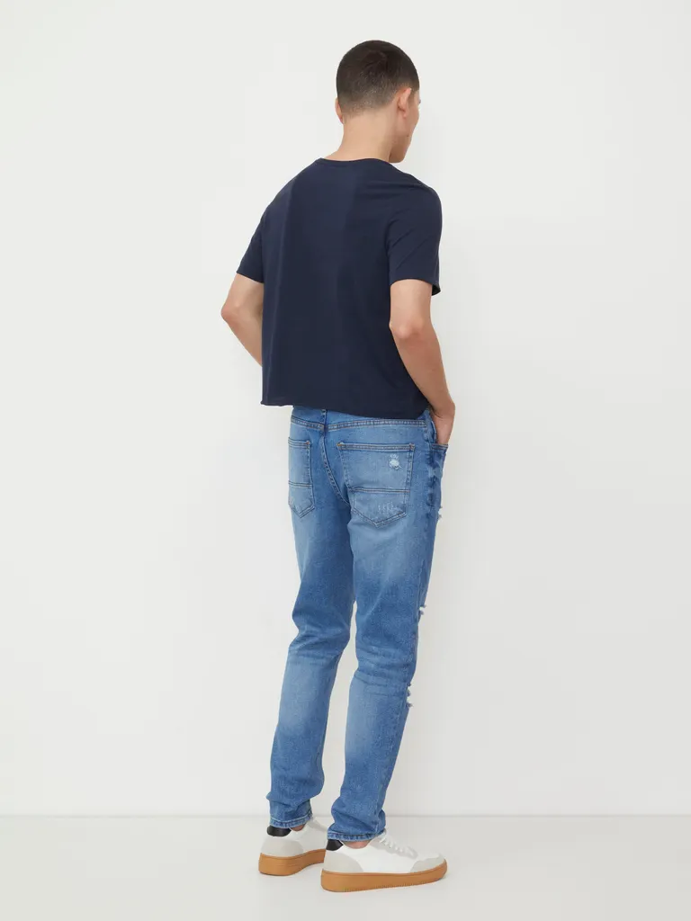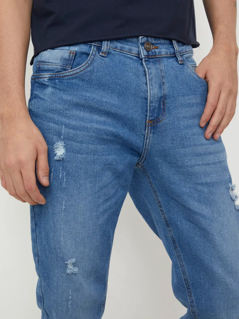 Jeans skinny azul claro, con ligeras destrucciones, cinco bolsillos, cierre frontal con cremallera.