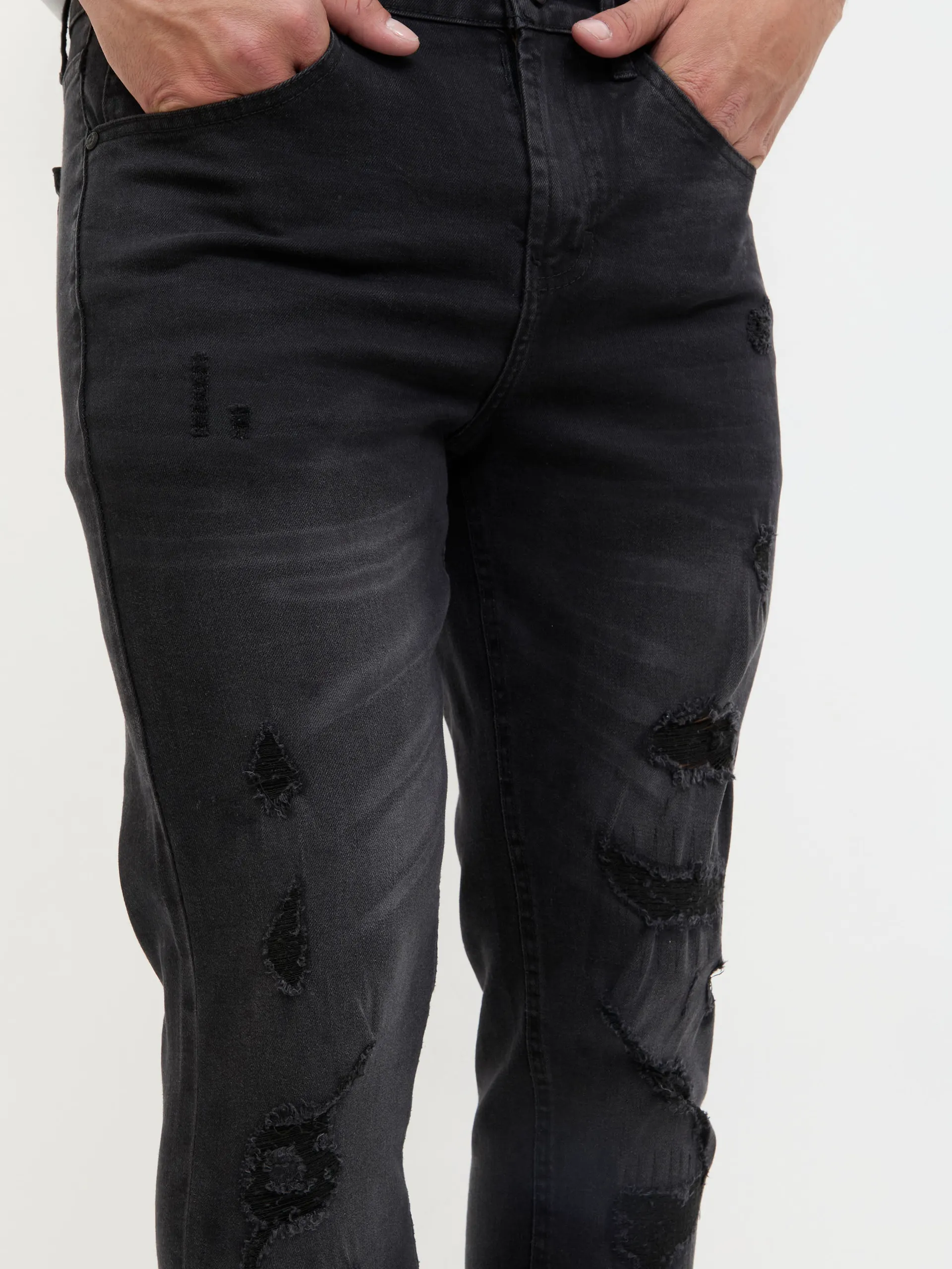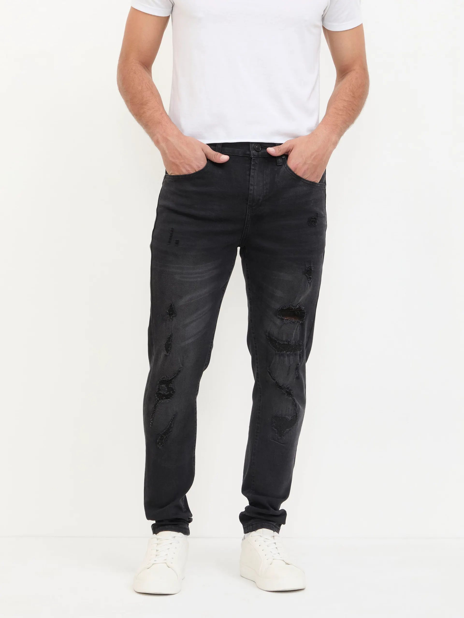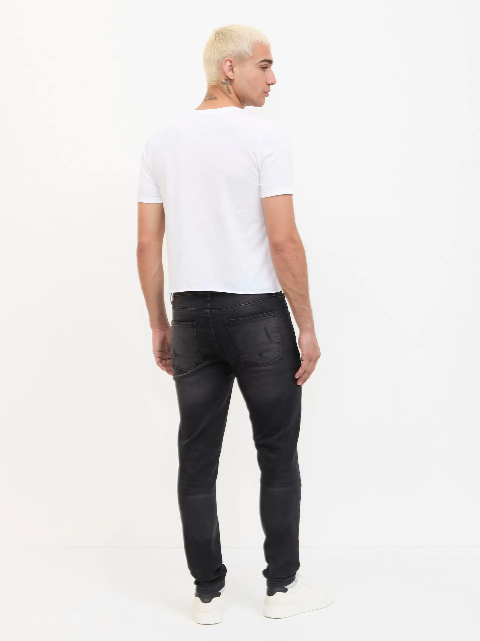 Jeans skinny color negro con destrucciones pretina sencilla con 5 bolsillos cierre frontal con cremallera.