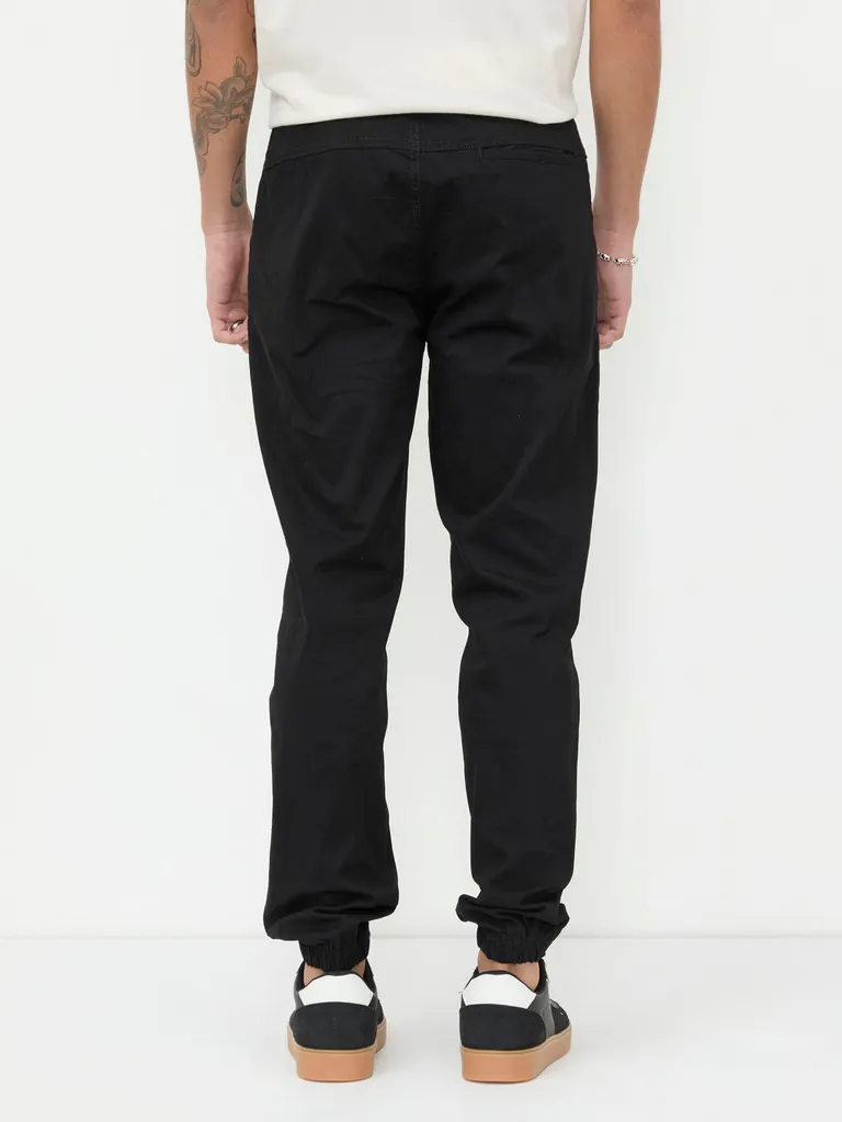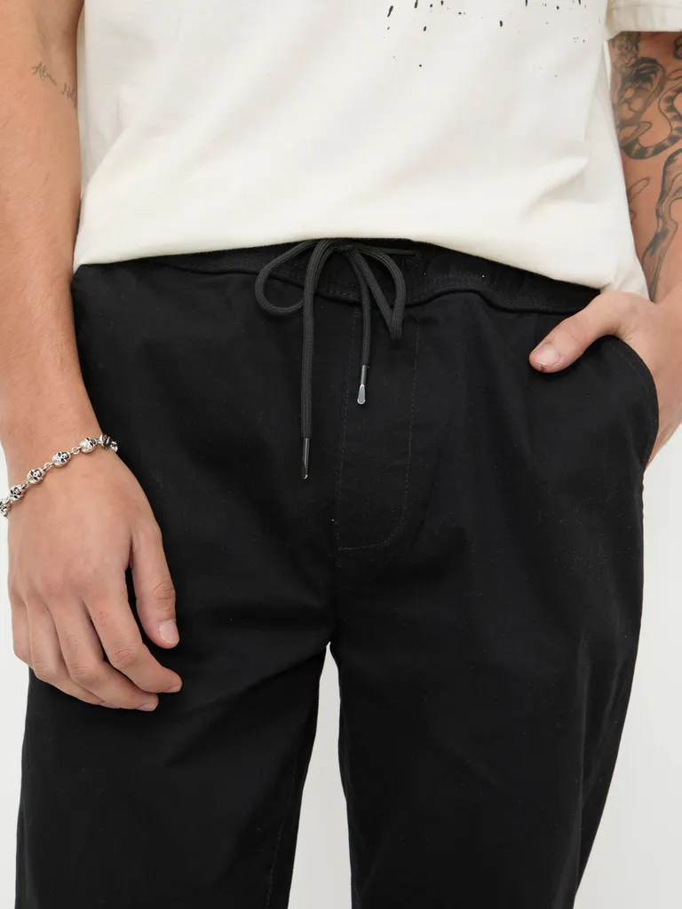 Jogger slim de gabardina negro con bolsillos frontales, jareta ajustable, pretina y tobillos elásticos.