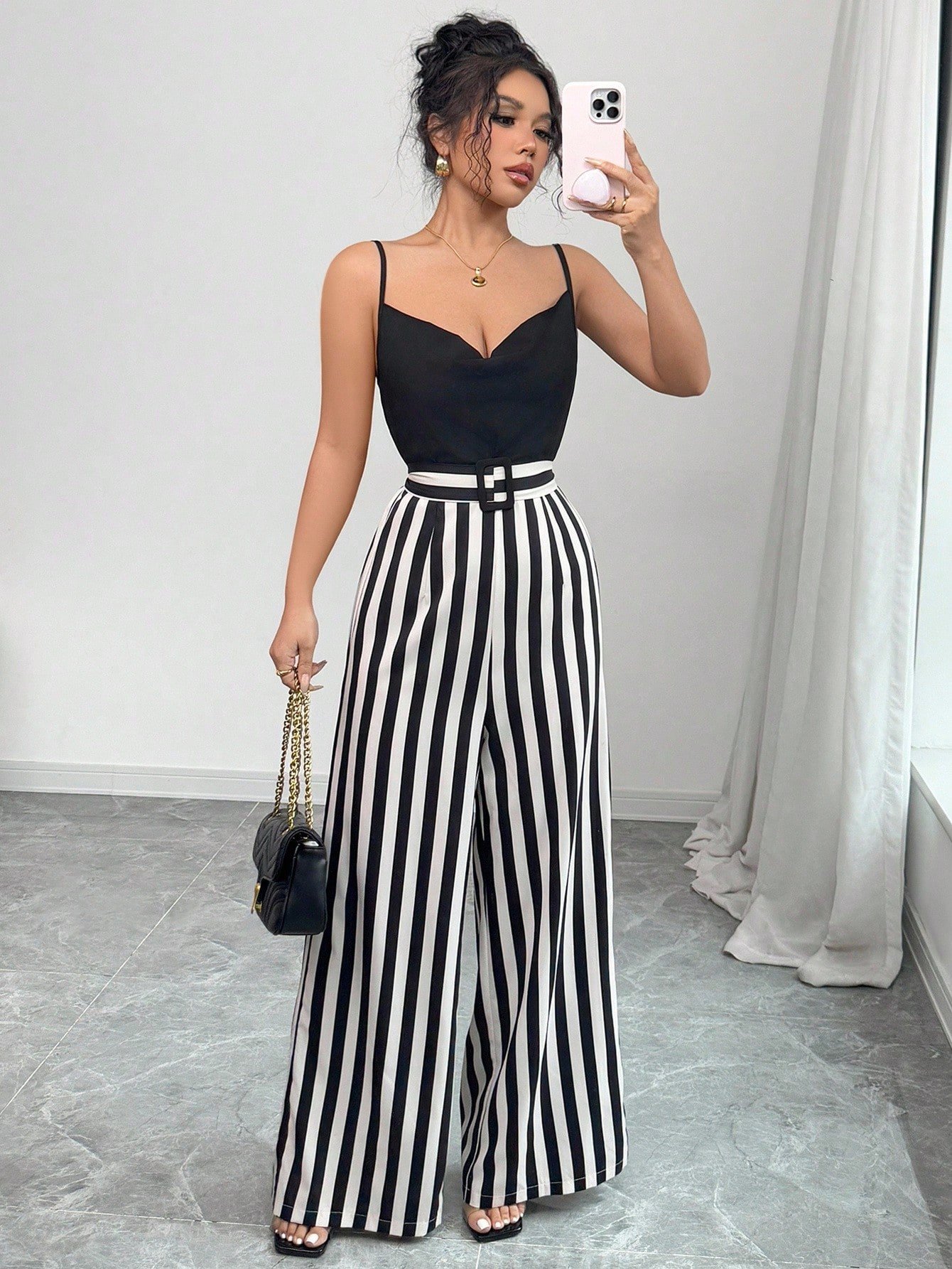Mono elegante con solapa, tirantes y contraste de rayas en la cintura con lazo