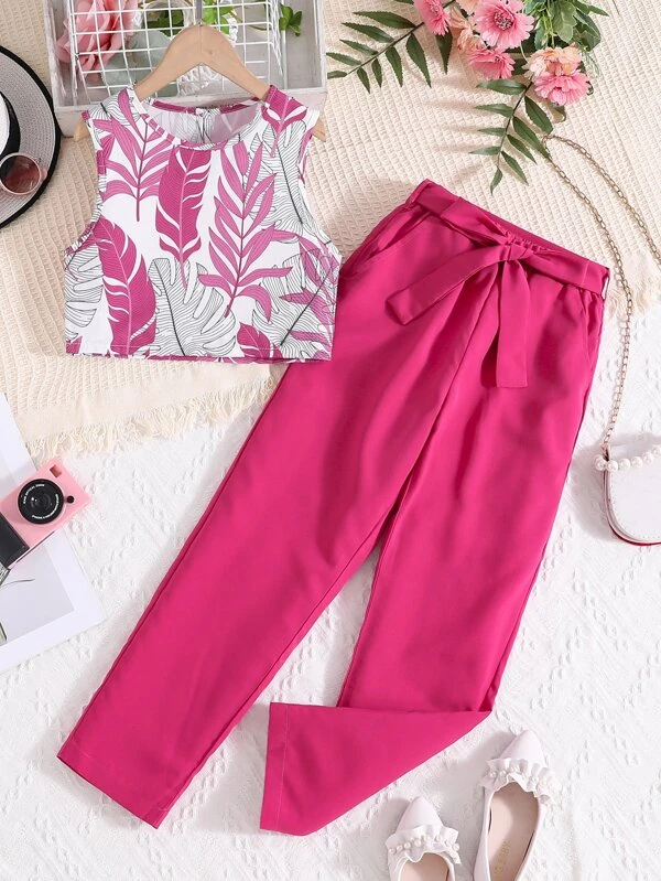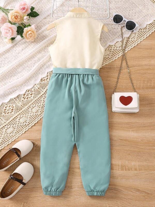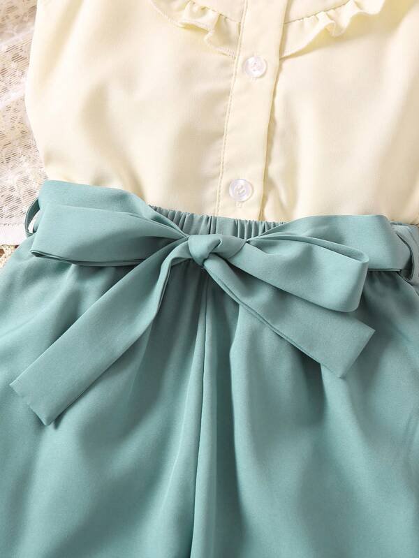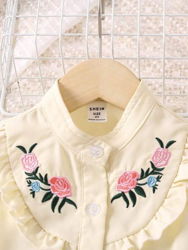 Niñas con bordado floral ribete con fruncido Blusa & con cinturón Pantalones