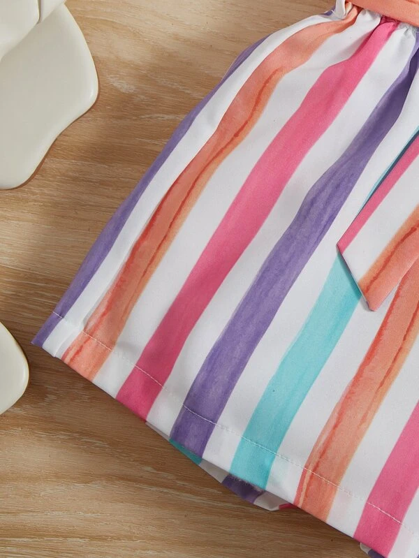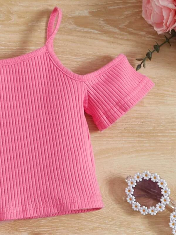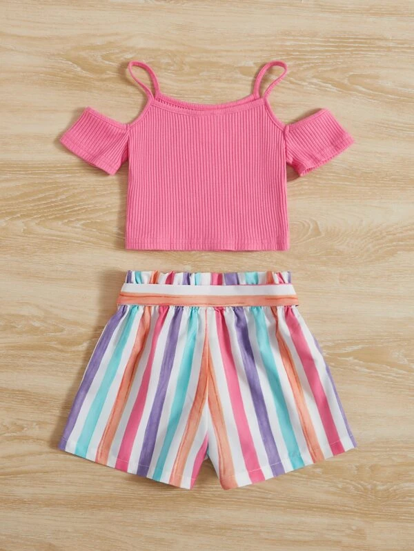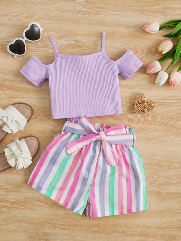 Ni?as de hombros descubiertos Camiseta & de rayas de cintura con volante Shorts con cintur?n