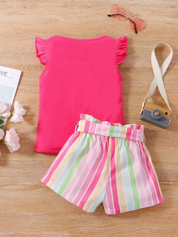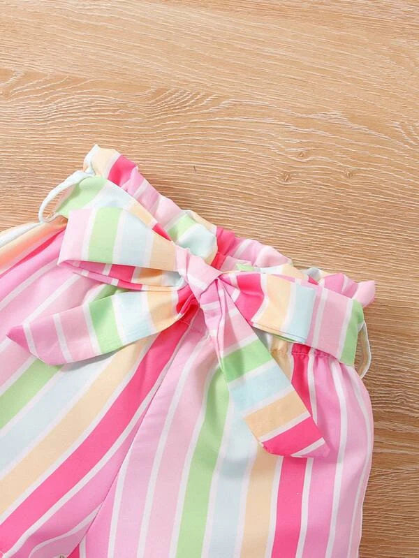 Ni?itas Camiseta de manga mariposa & Shorts de rayas combinadas con cintur?n