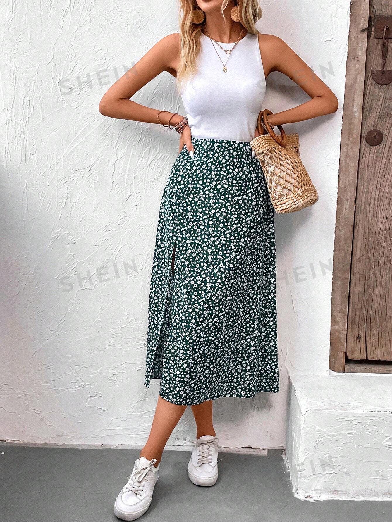 Conjunto de falda con tiras de textura tejida con estampado de flores blanco y azul