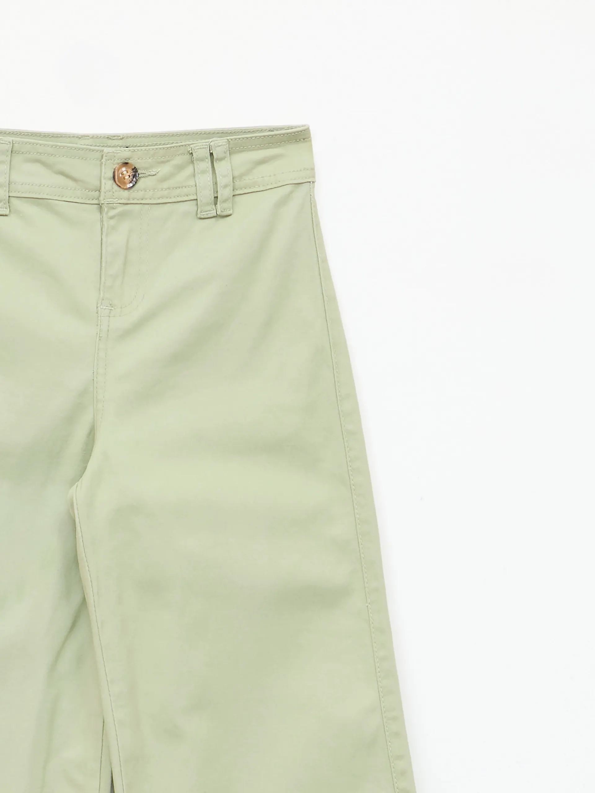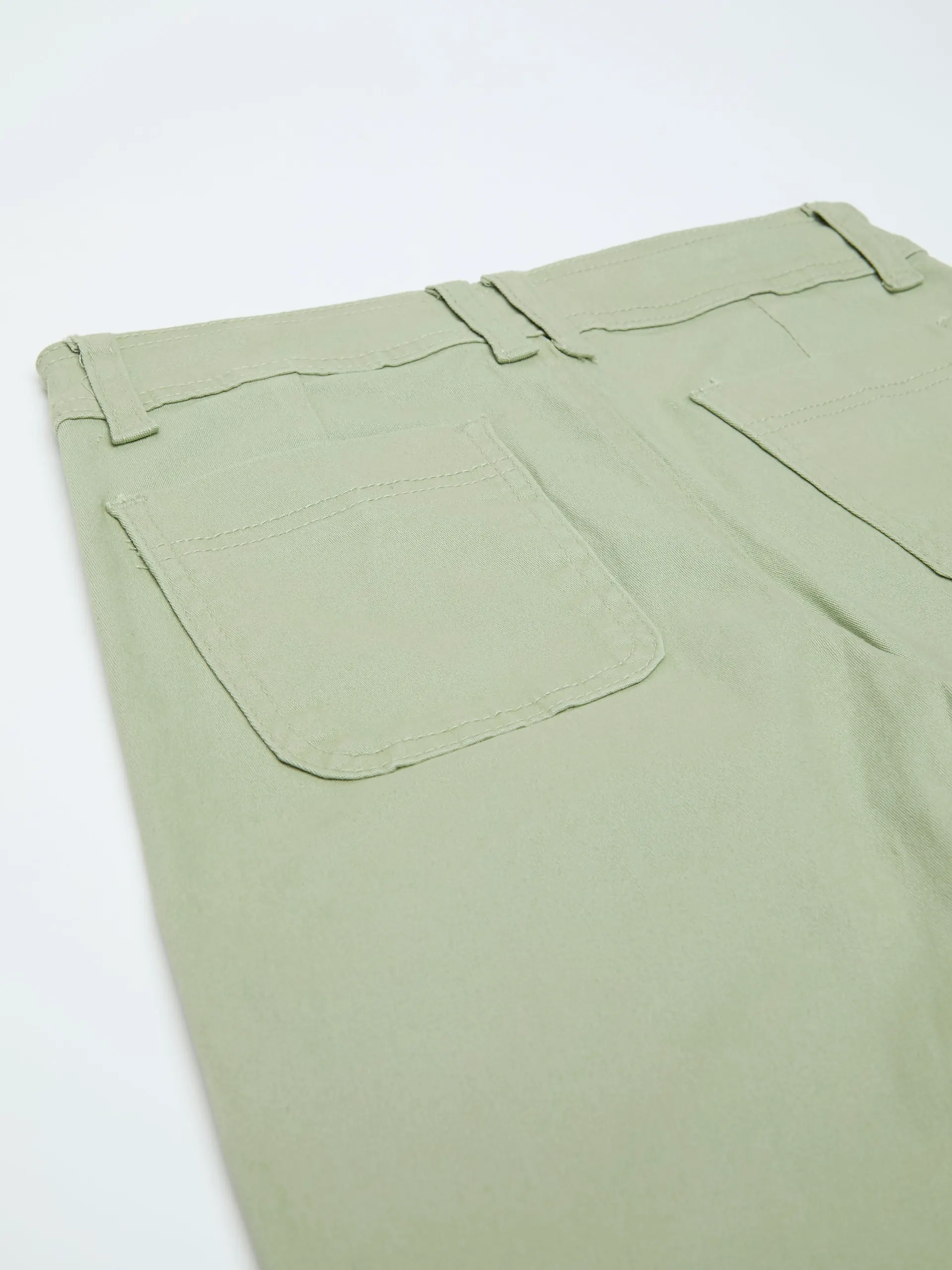 Pantalón verde amplio de gabardina con botón y bolsillos frontales.