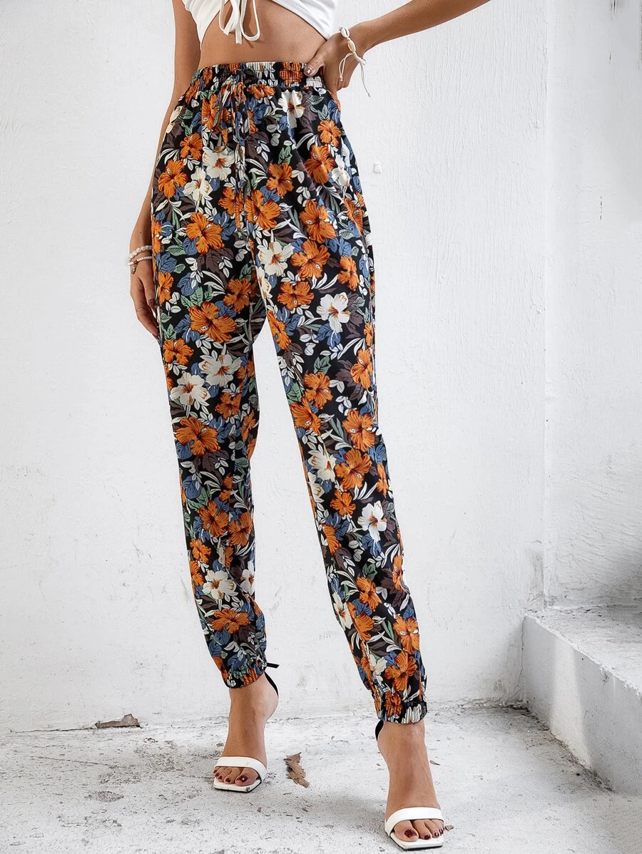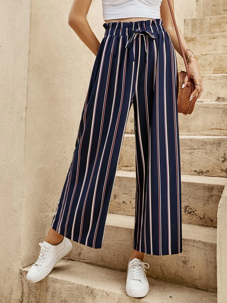 Pantalones de pierna ancha de rayas con cord?n de cintura con volante