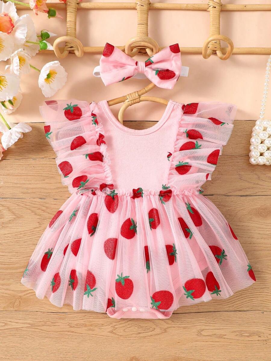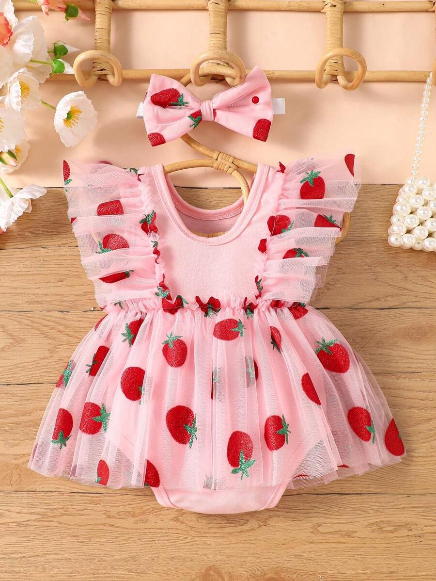 pelele de tutú de red de tulle con fresas y diadema de fresa
