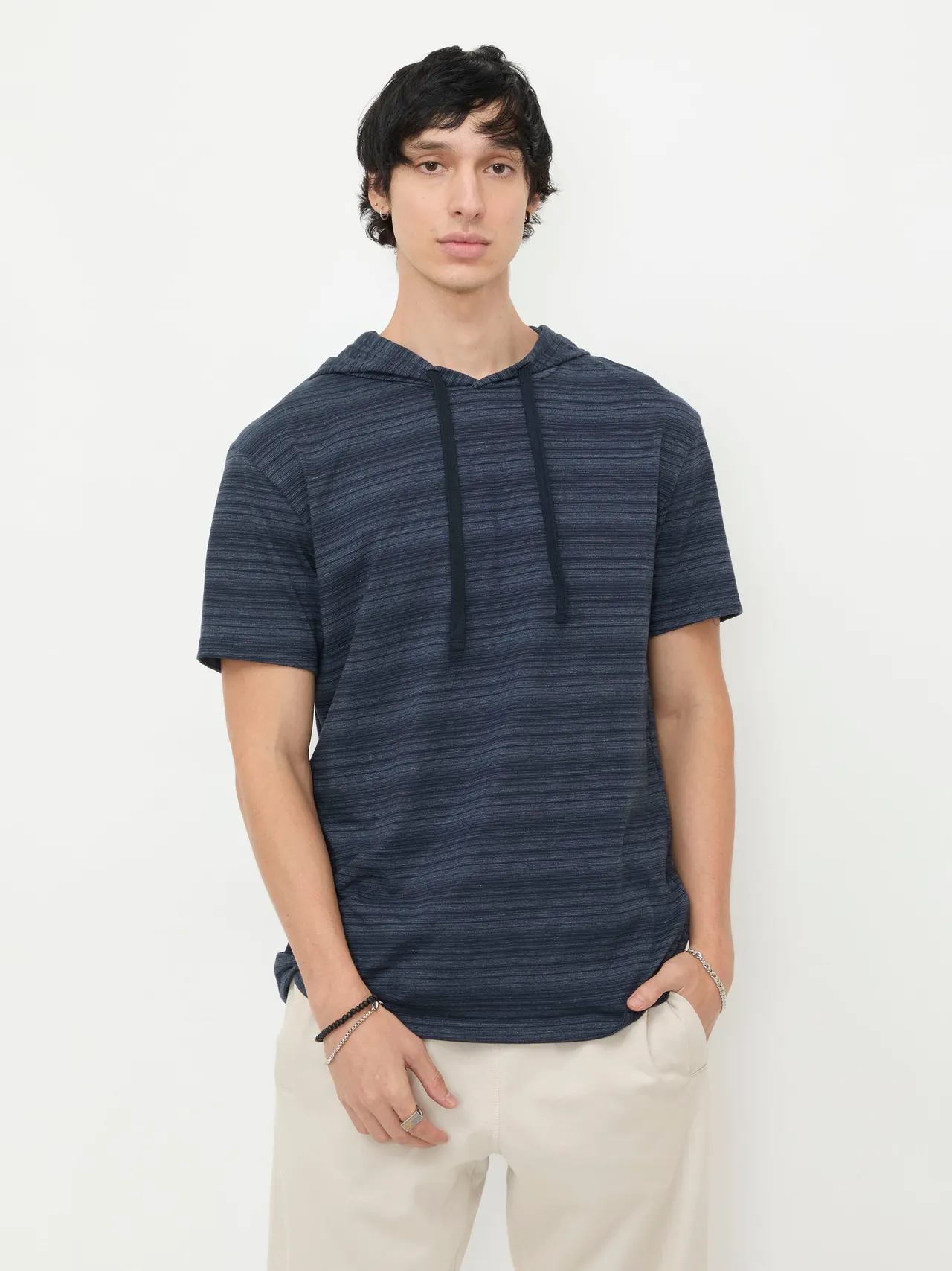 Playera negra cuello redondo, manga corta, con cortes en color y tejido contraste.