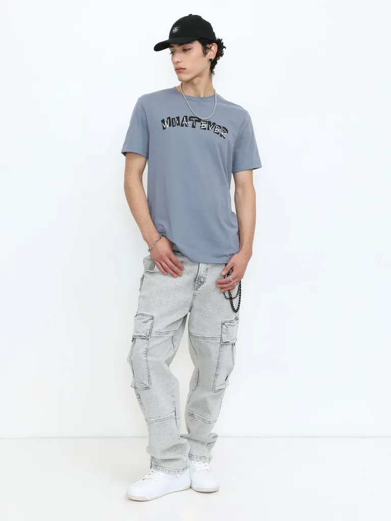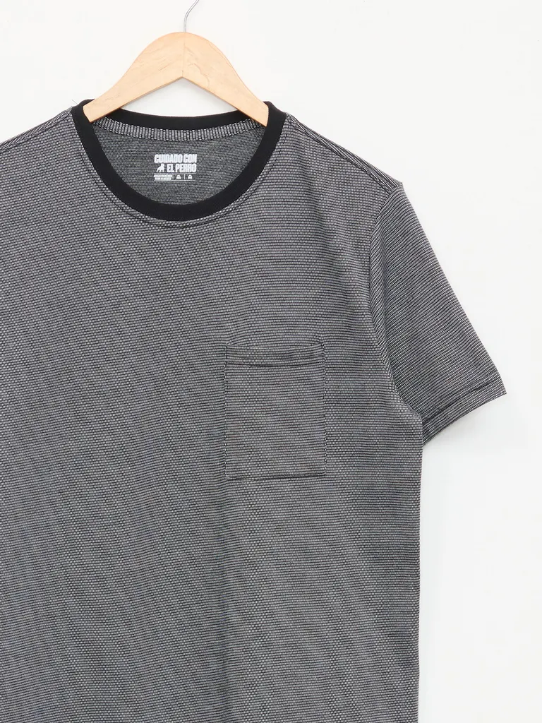 Playera gris manga corta con bolsillo frontal y contraste en cuello.