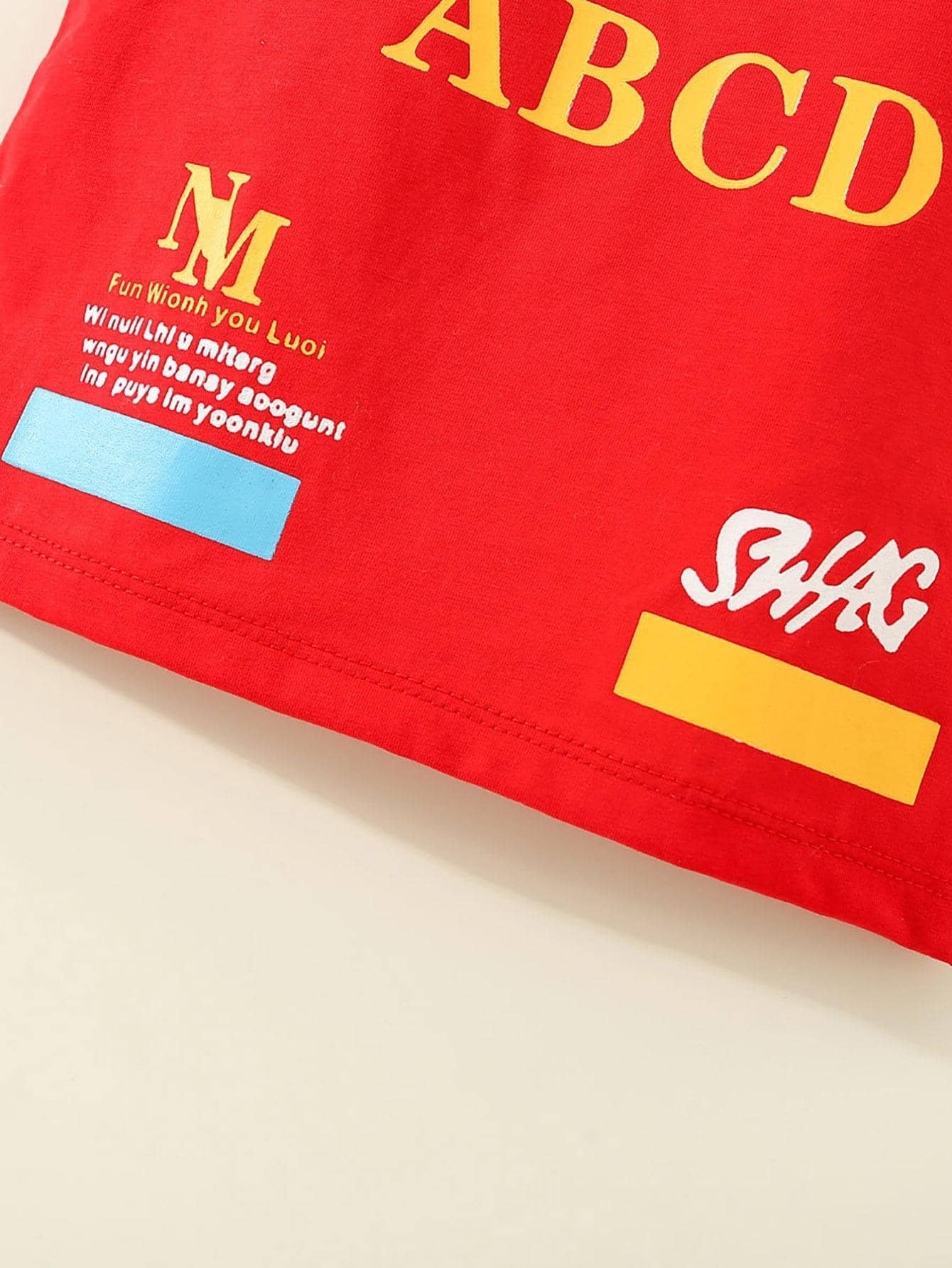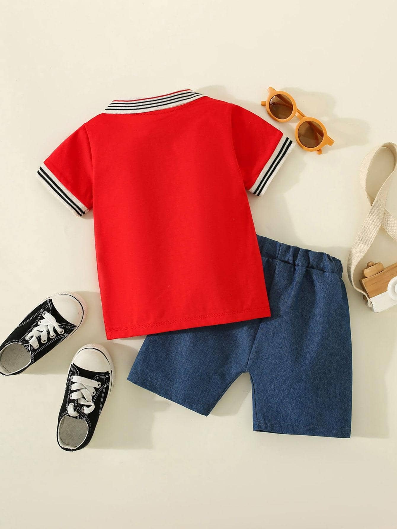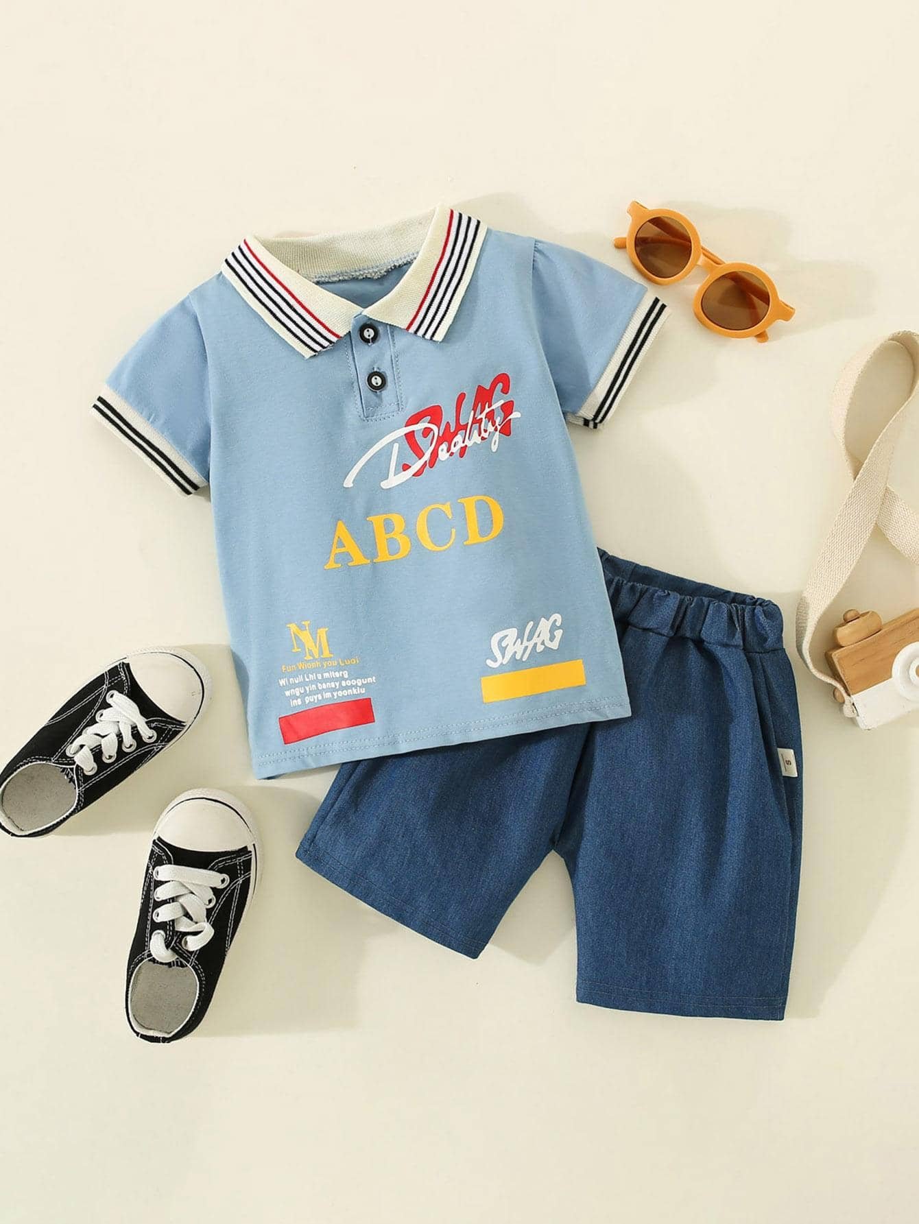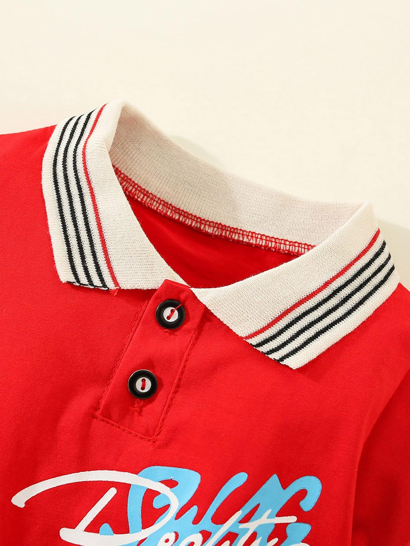 Polo de manga corta con estampado de letras de algod?n puro para ni?os peque?os de 2 piezas y pantalones cortos de color s?lido