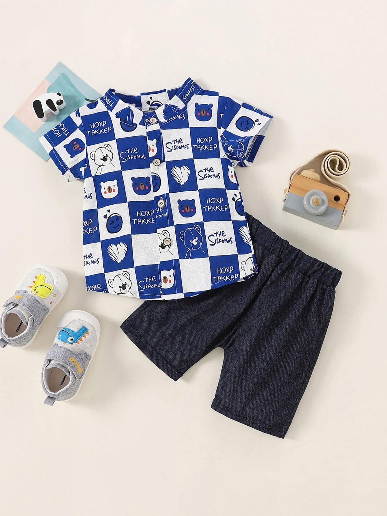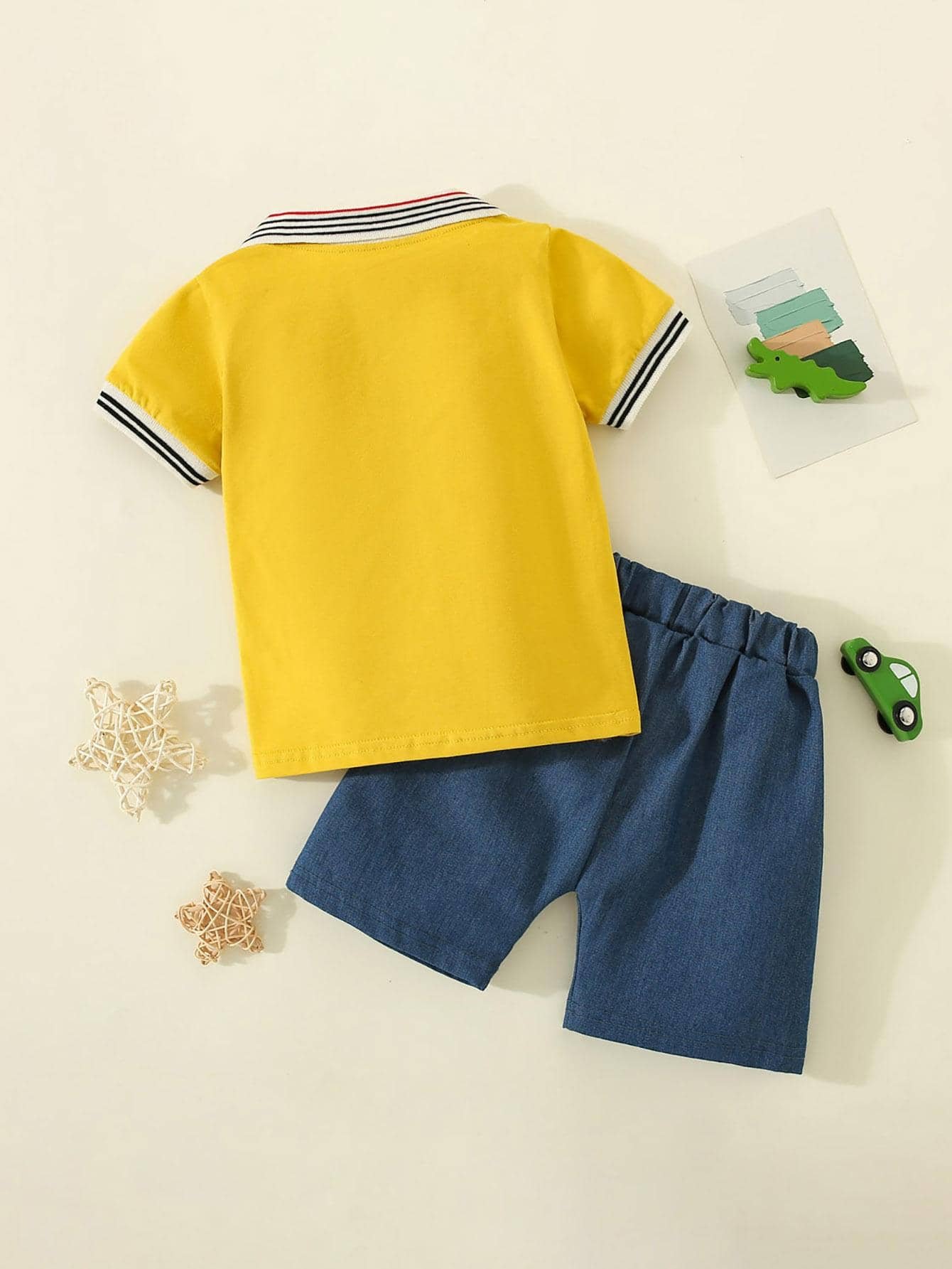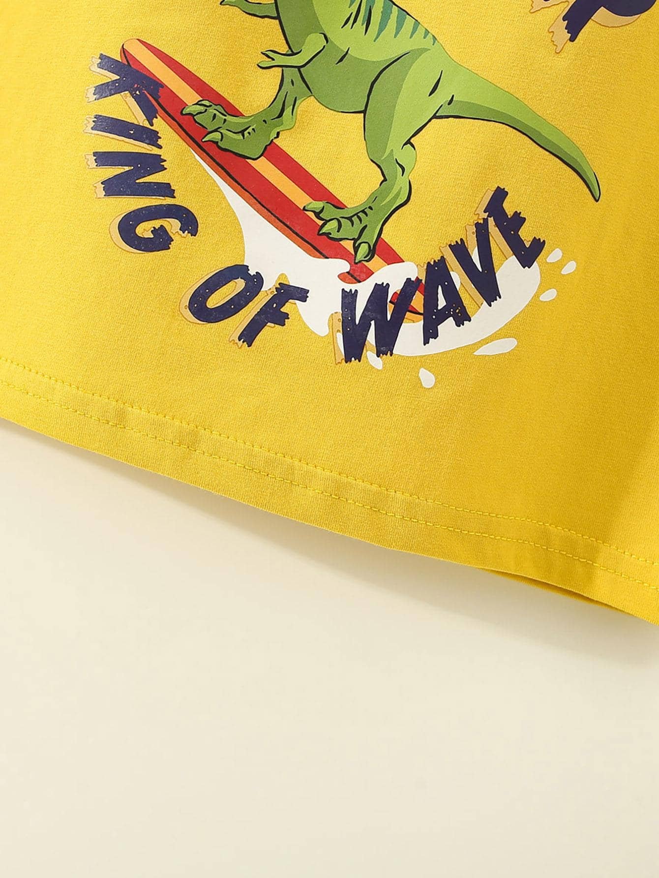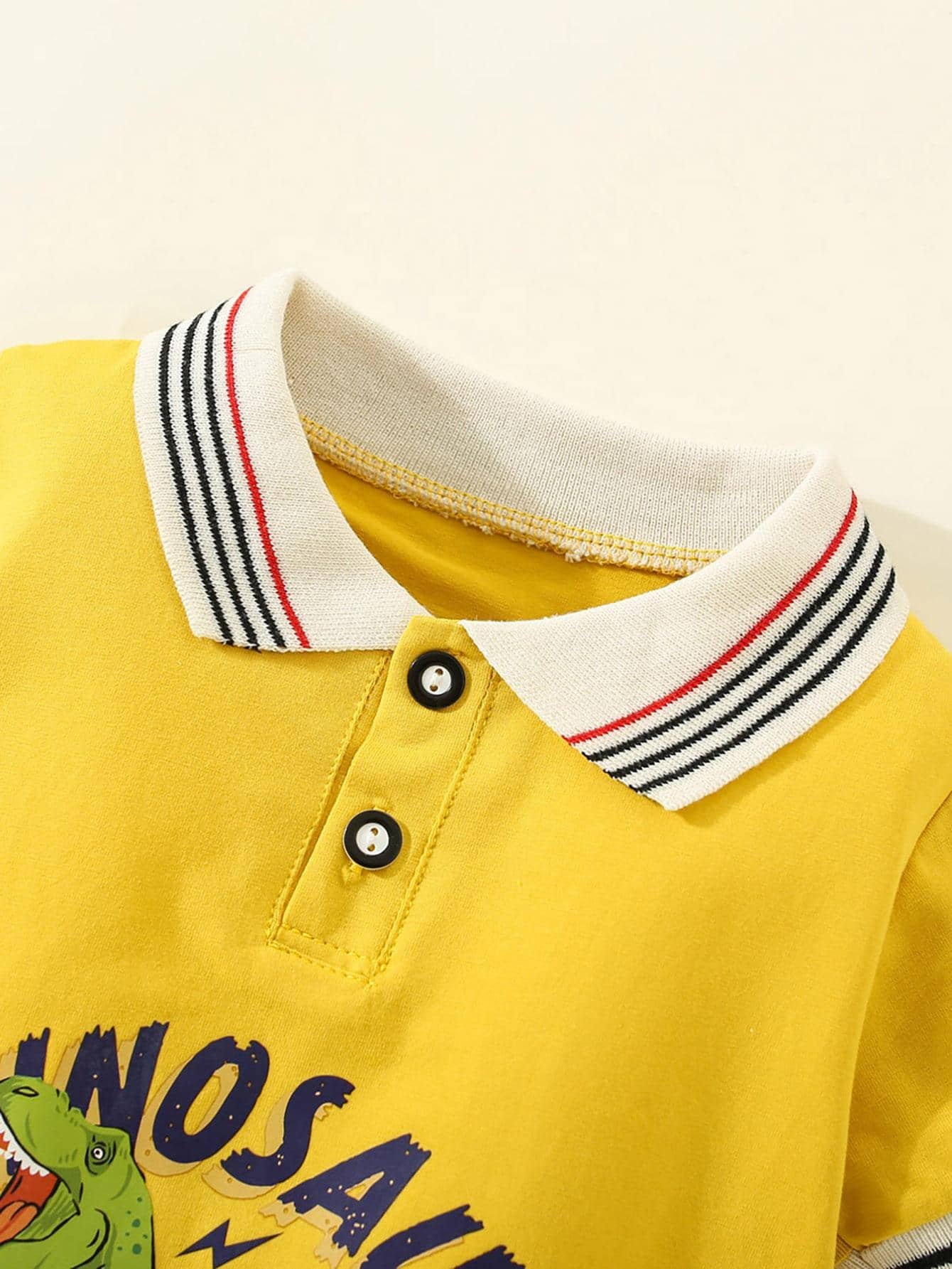 Polo de manga corta con estampado de letras y dinosaurios de algod?n puro para ni?os peque?os de 2 piezas y pantalones cortos de color s?lido