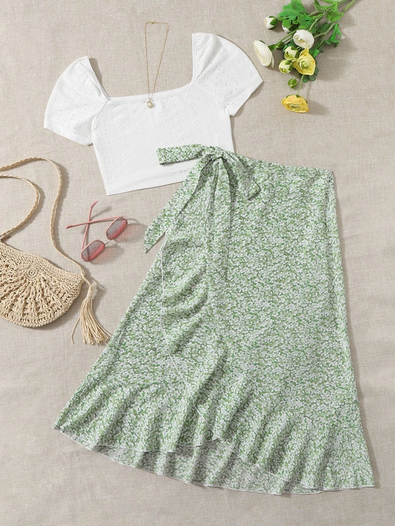 Qutie con estampado de cuadros de cuello con solapa Camisa crop & Falda bajo con abertura