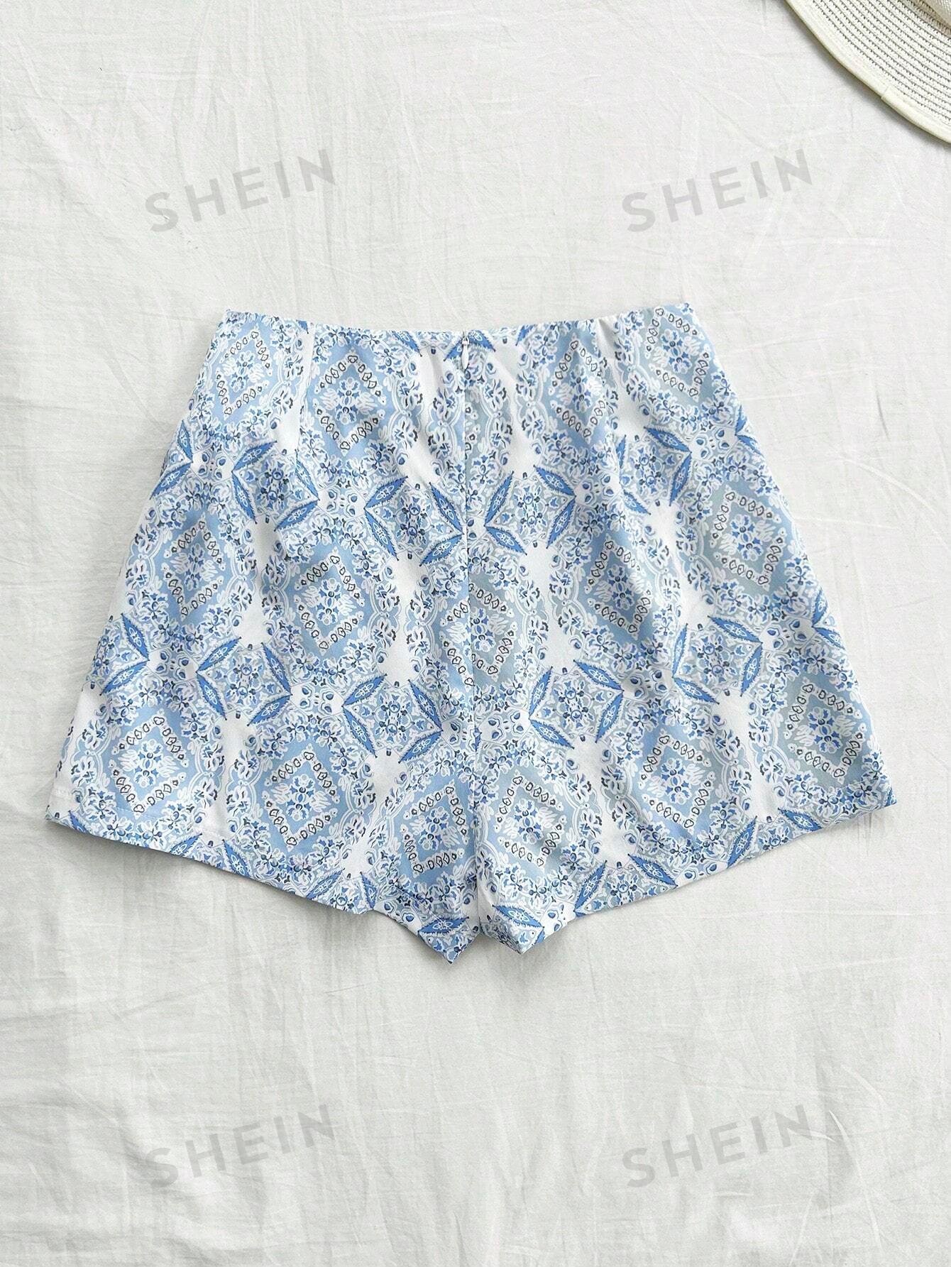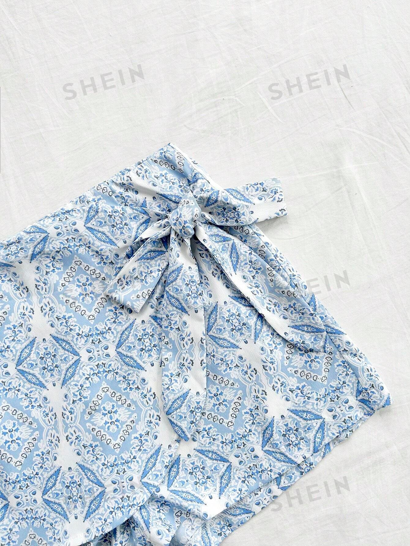 Shorts con cinturón de envoltura floral texturizado jacquard verde