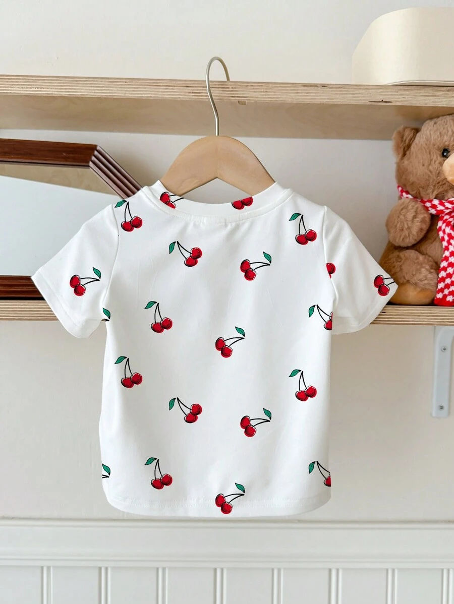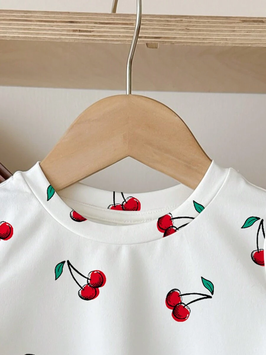 Top ajustado de manga corta con cuello redondo, estampado de cerezas blancas