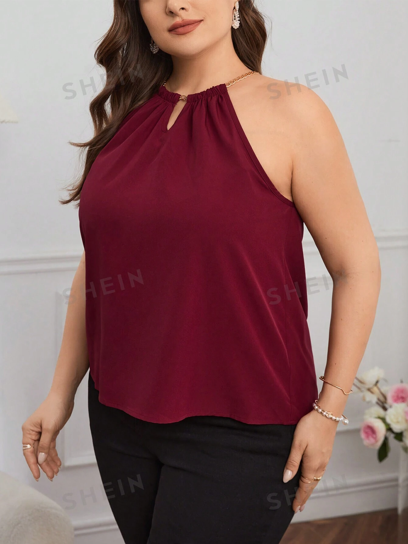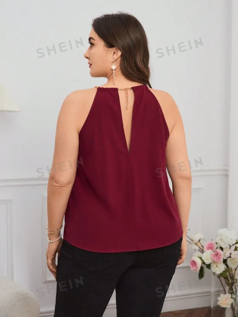 Top De Talla Grande Con Cuello Halter Decorado Con Cadena Elegante