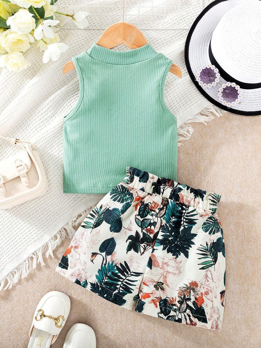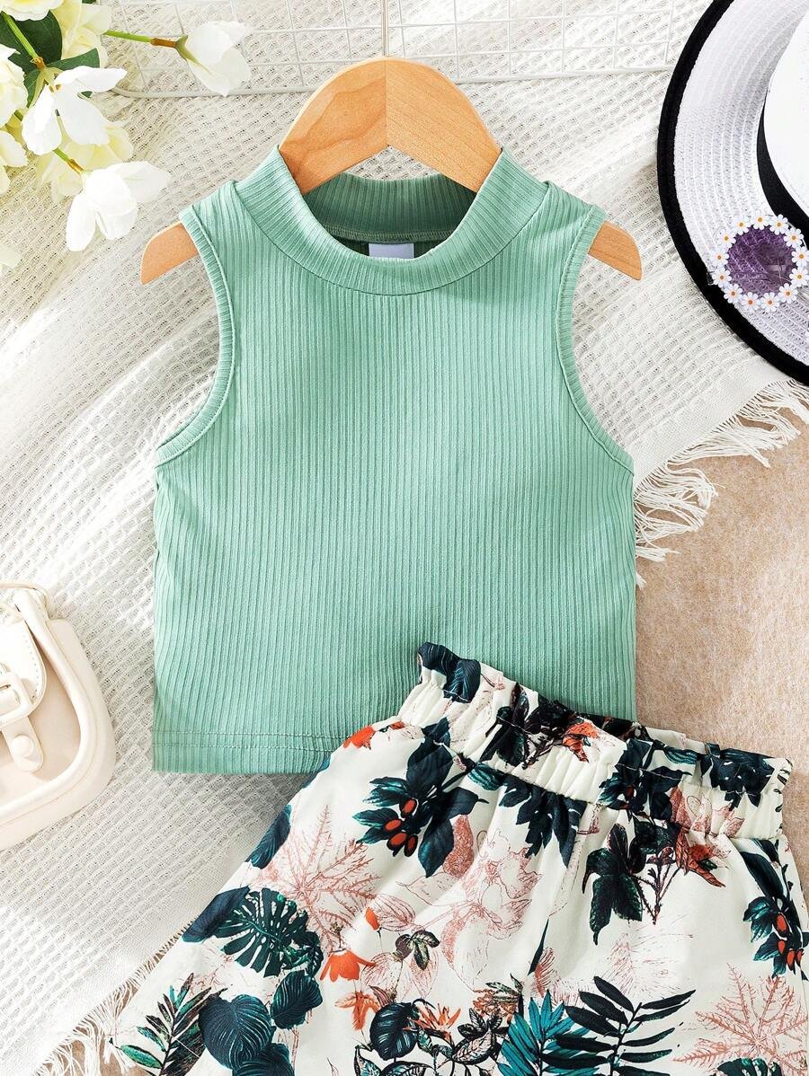 top de tirantes acanalado de unicolor y shorts impresos con plantas