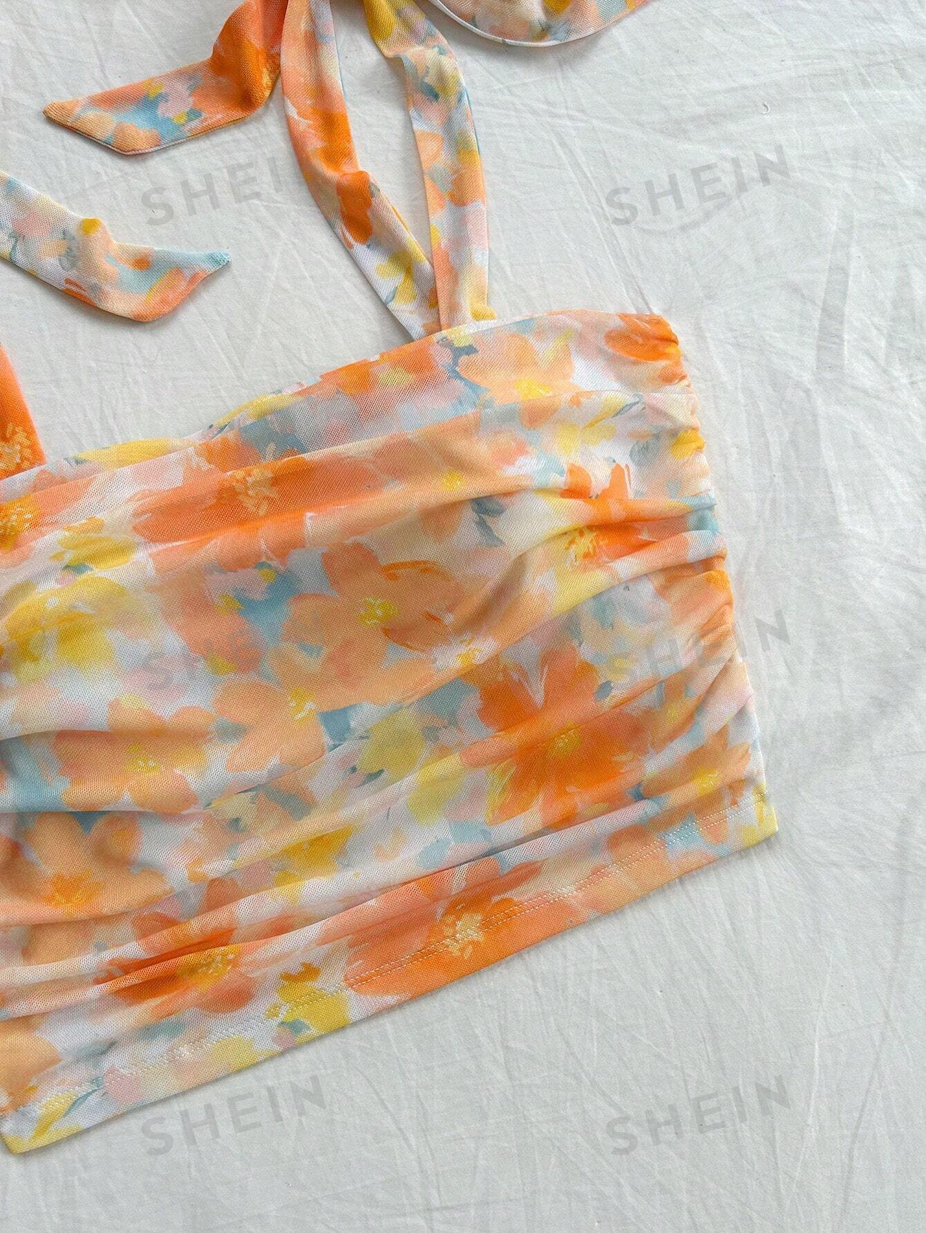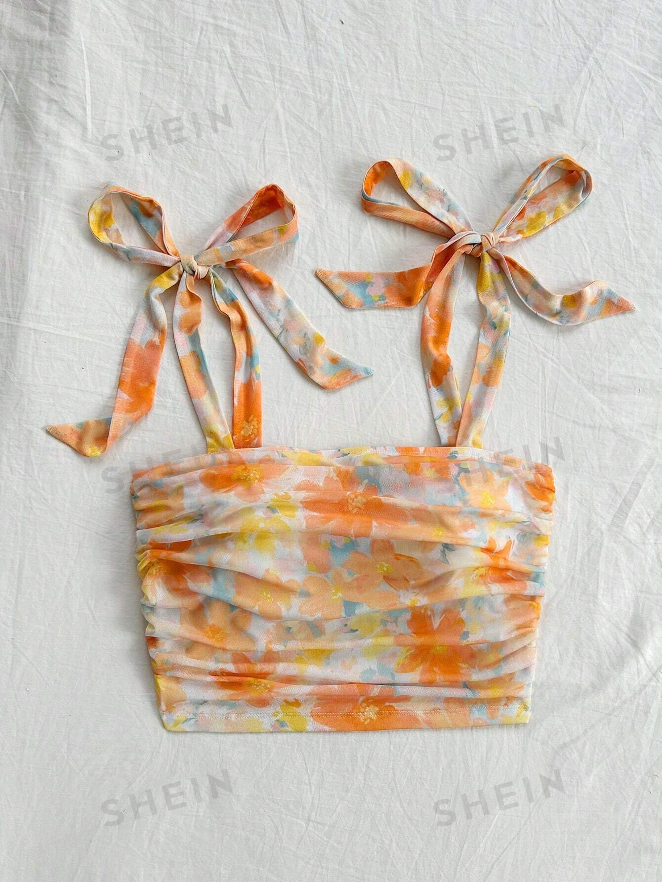 Top de tirantes con lazo para mujeres con estampado floral plisado casual