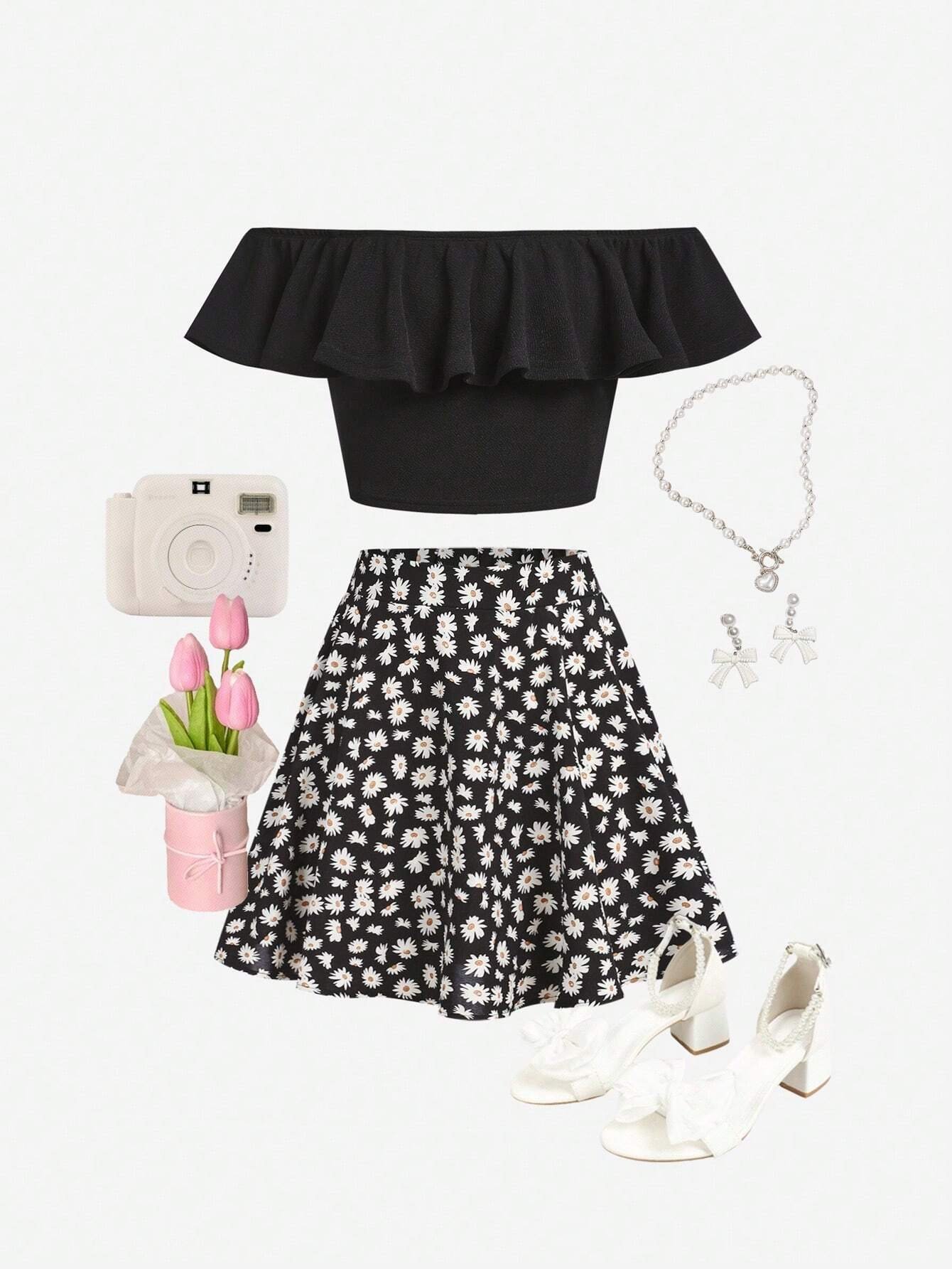 Top de un hombro & falda floral bajo con fruncido