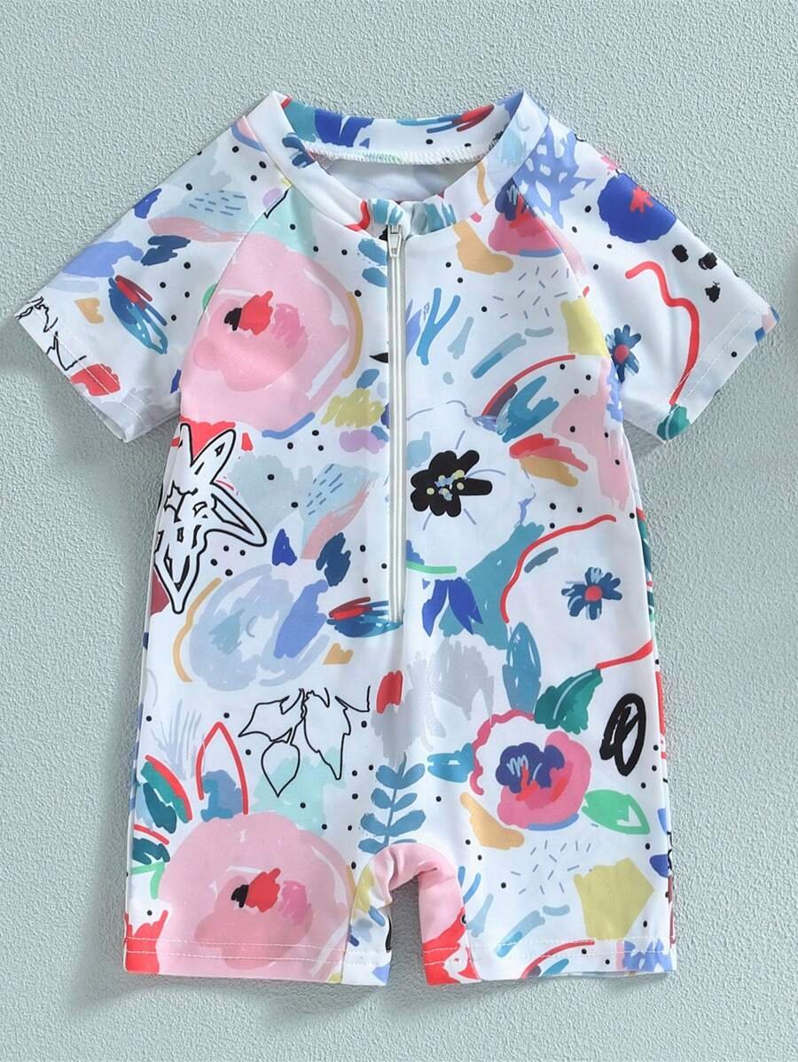 Traje De Ba?o De Una Pieza Con Manga Ragl?n Gr?fica De Caricatura Para Ni?a Beb? Y Gorro De Nataci?n