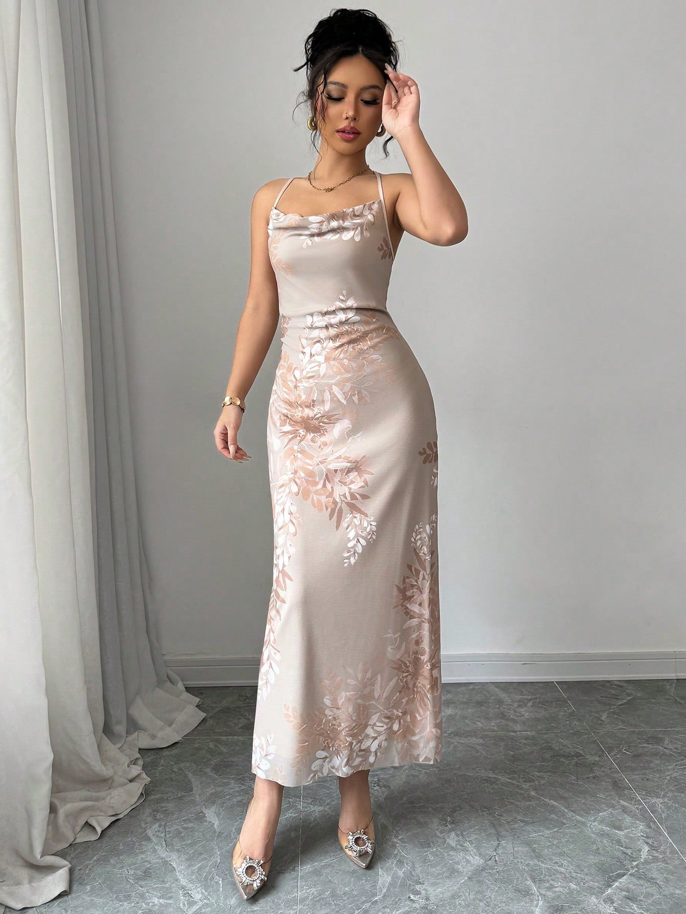 Vestido de tirantes unicolor fruncido de muslo con abertura de saten