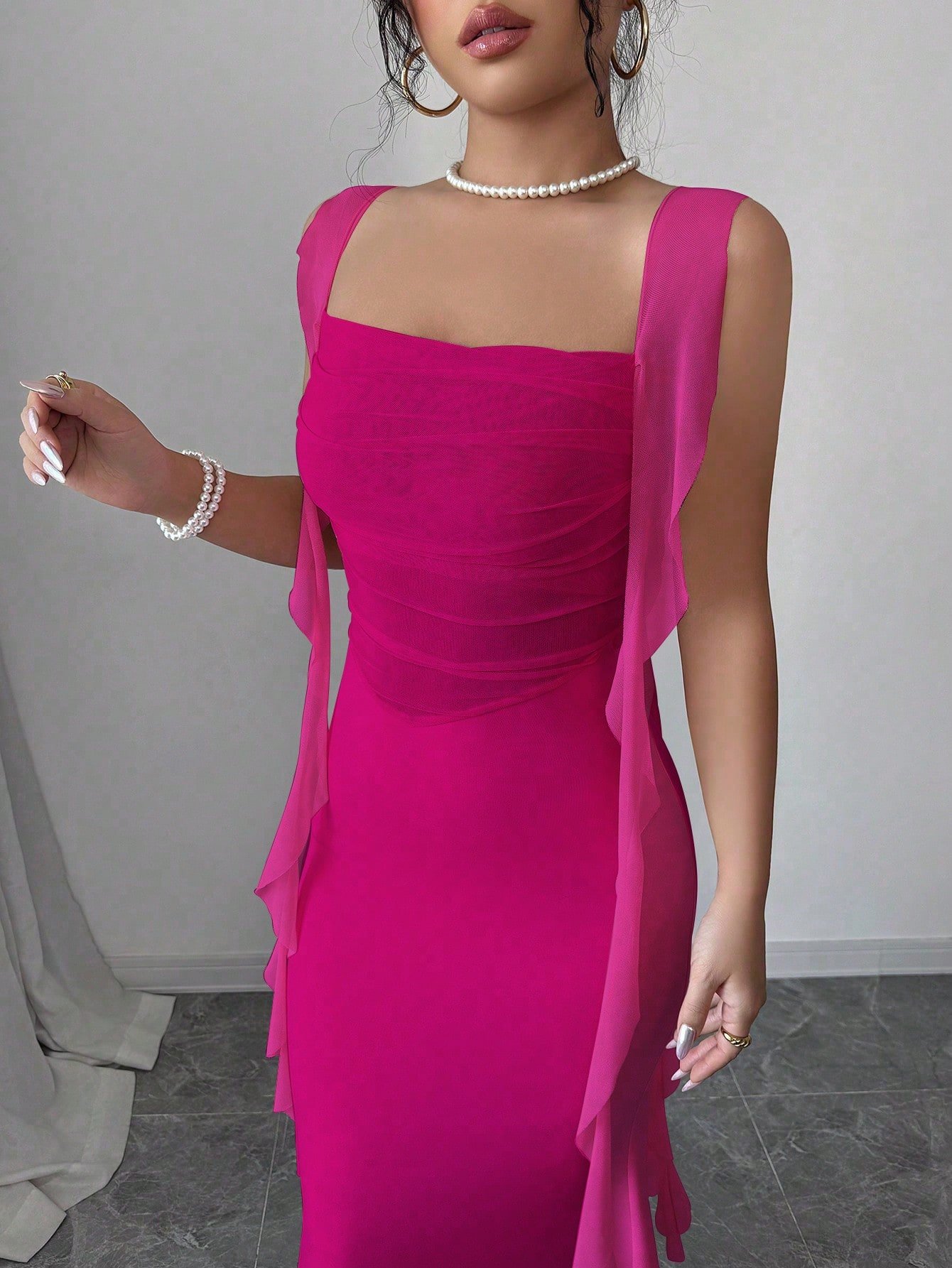 Vestido de tirantes unicolor fruncido de muslo con abertura de saten