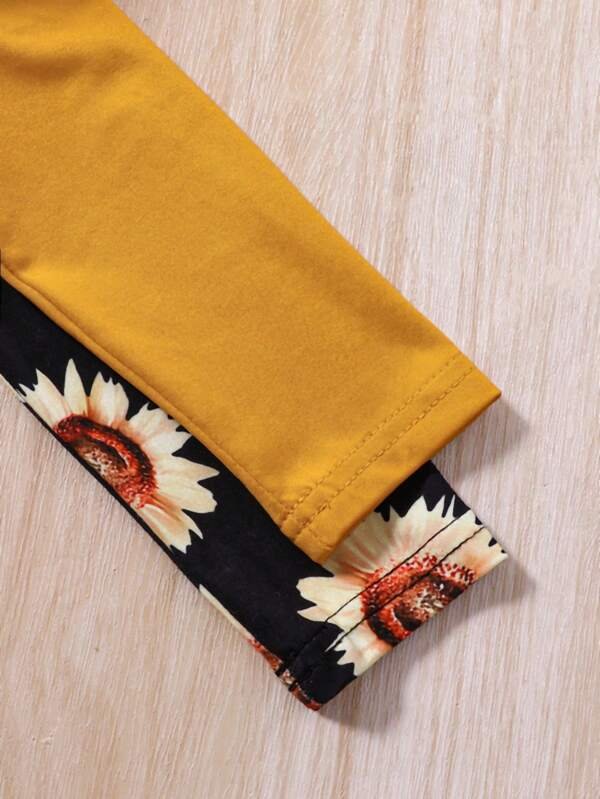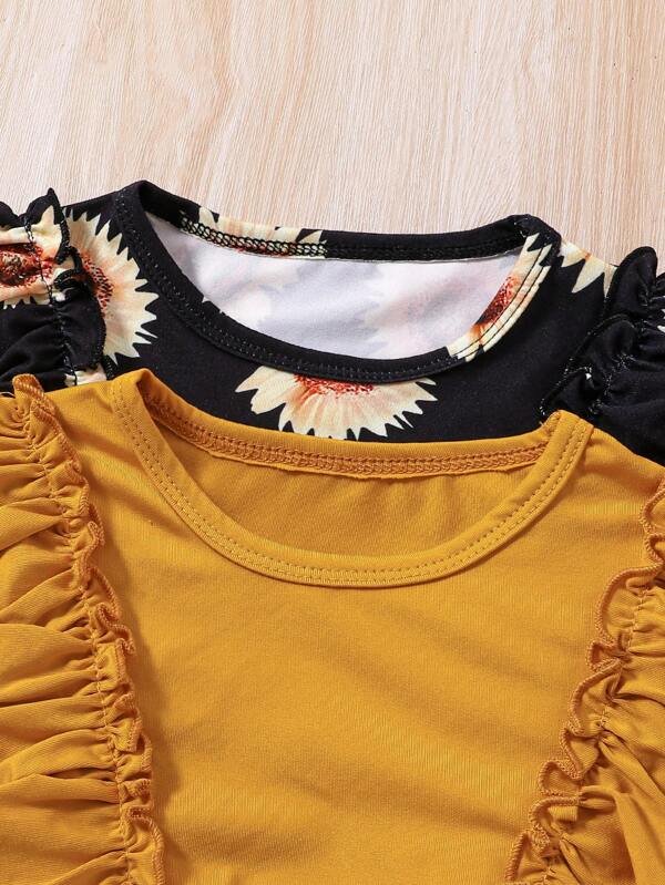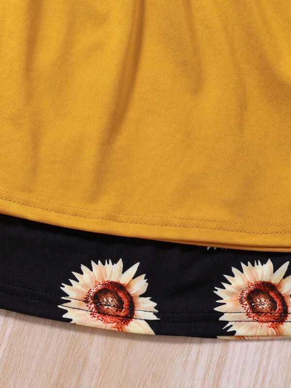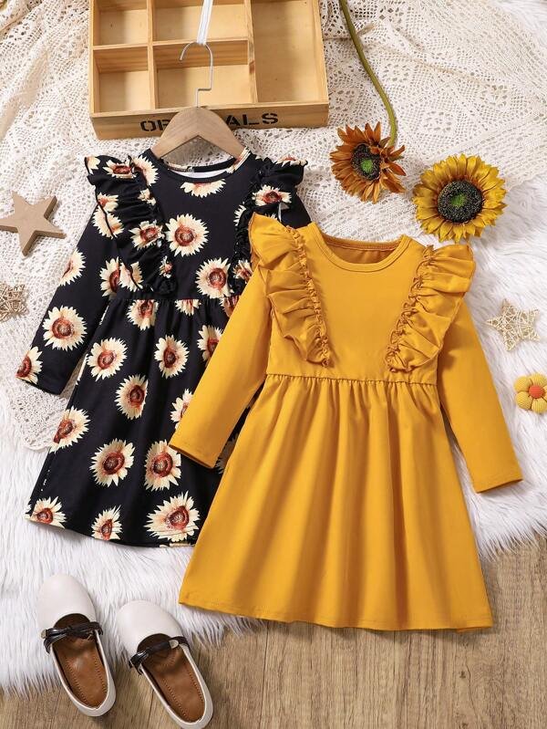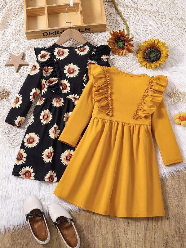 Vestido Casual, Rom?ntico Y Con Volantes Para Ni?as Peque?as Con Estampado De Girasol