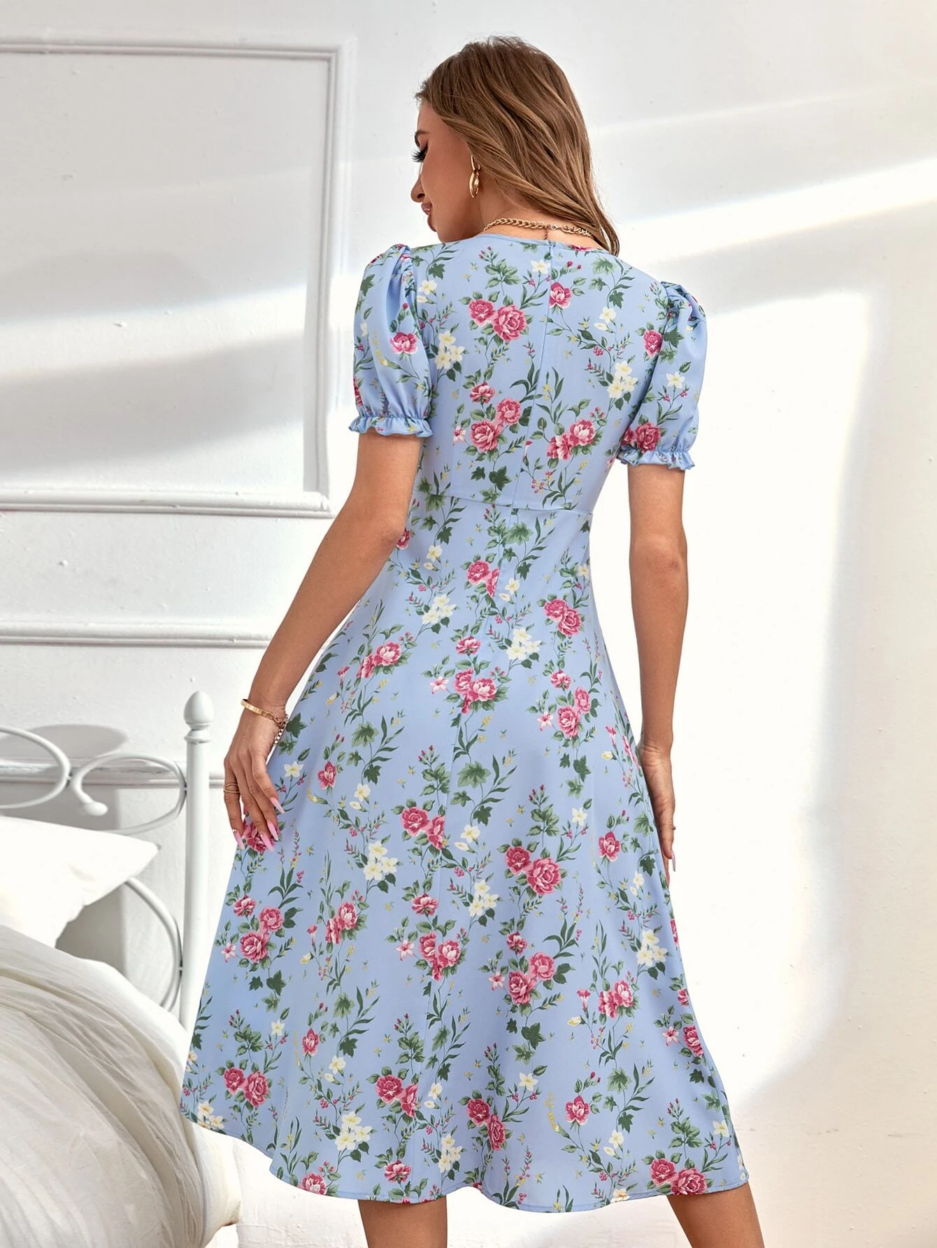 Vestido bustier con estampado floral de manga farol fruncido de muslo con abertura