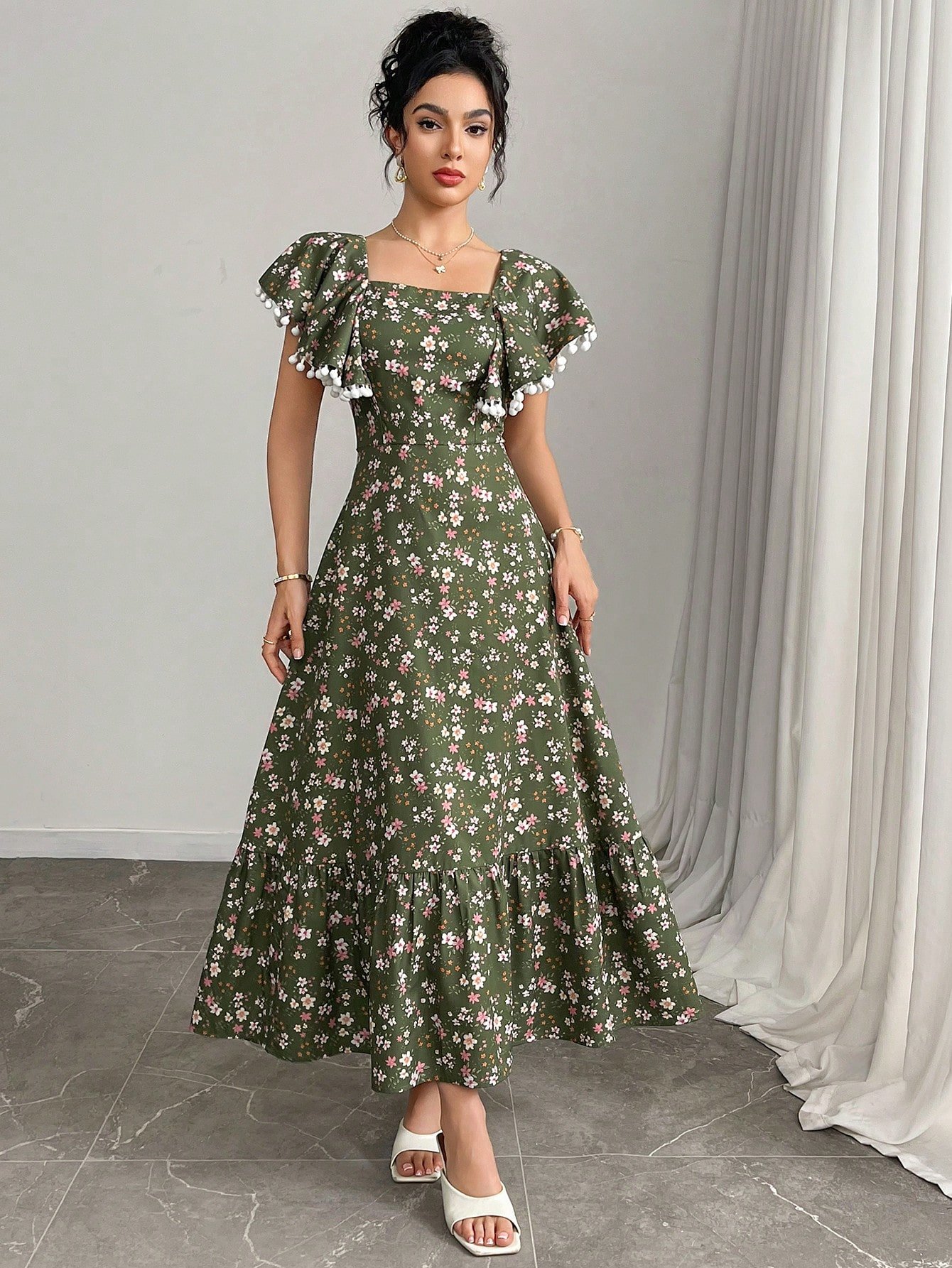 Vestido con estampado floral ribete con fleco de manga farol cruzado con nudo lateral