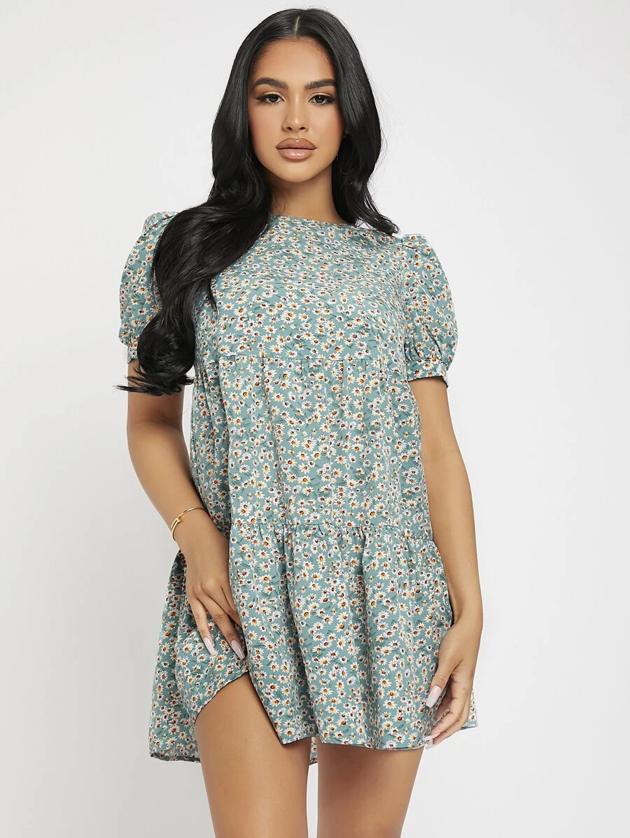 Vestido con cintur?n con estampado floral de manga con volante