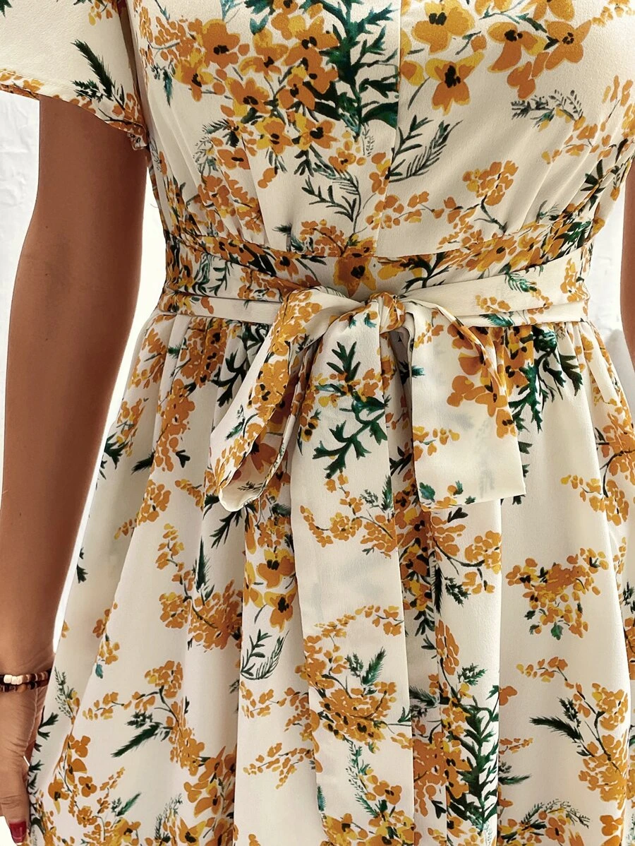 Vestido con cintur?n con estampado floral de manga mariposa
