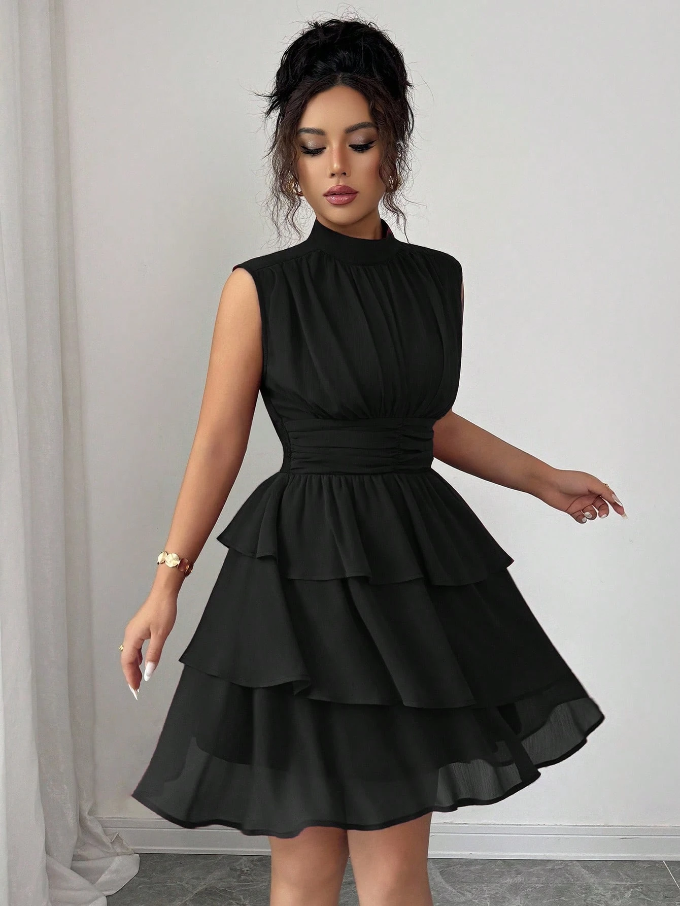Vestido con detalles de volantes y pliegues a juego en blanco y negro
