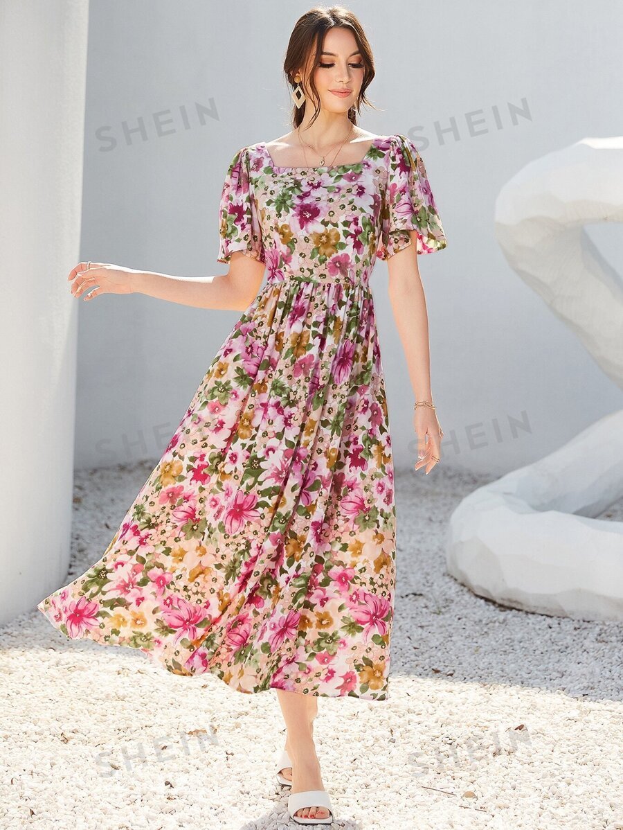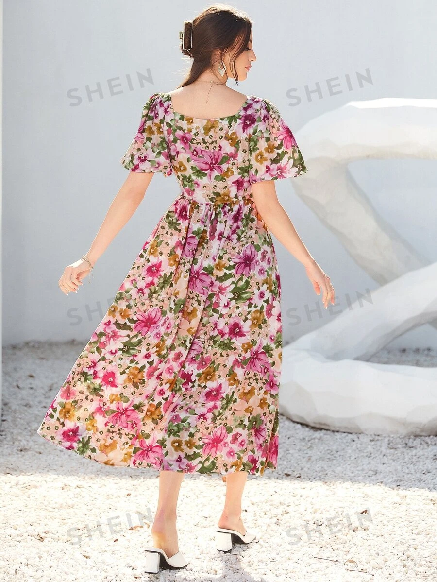 Vestido con estampado floral de cuello cuadrado de manga mariposa