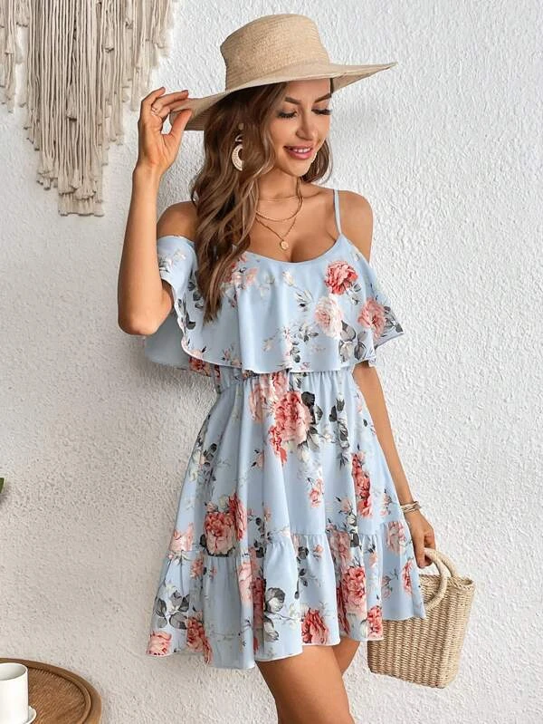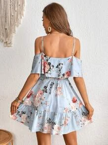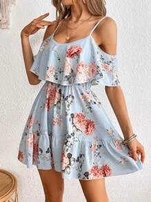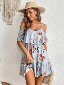 Vestido con estampado floral de hombros descubiertos bajo con fruncido