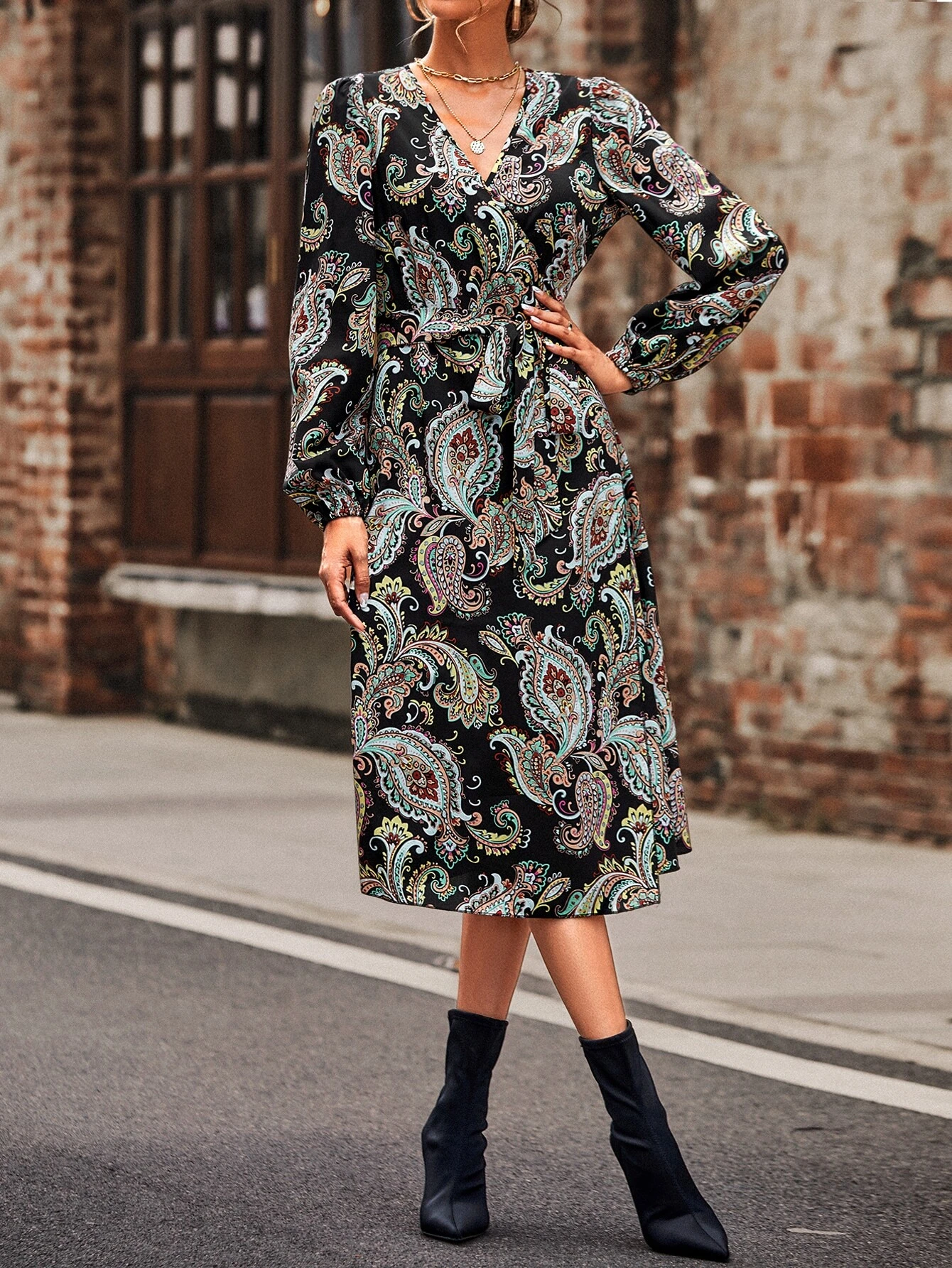 Vestido con estampado floral de manga farol de muslo con abertura