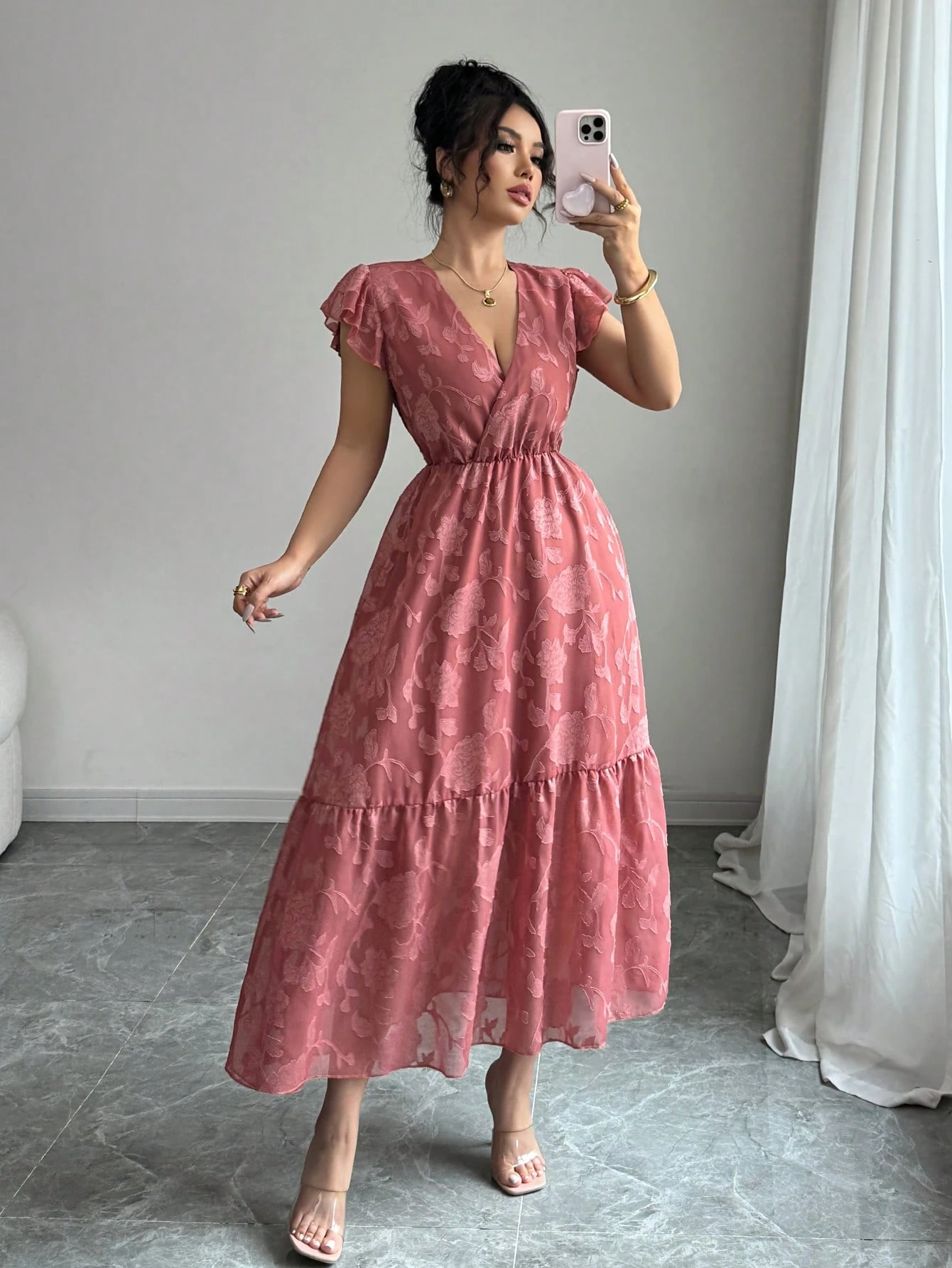 Vestido con estampado floral ribete con fleco de manga farol cruzado con nudo lateral